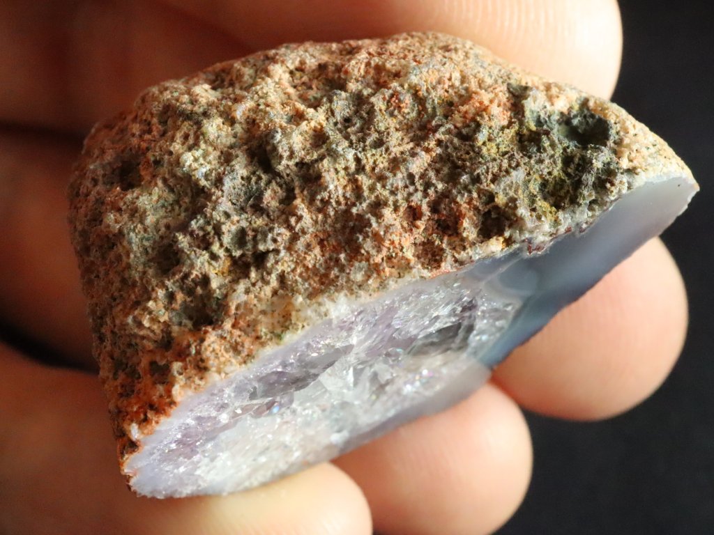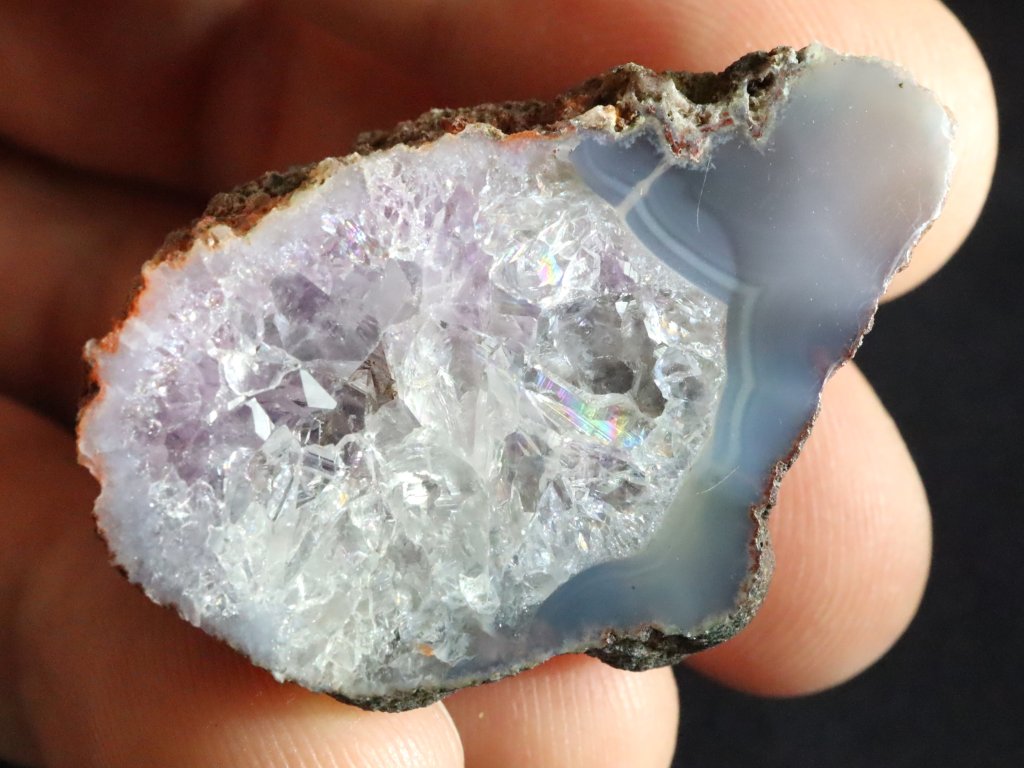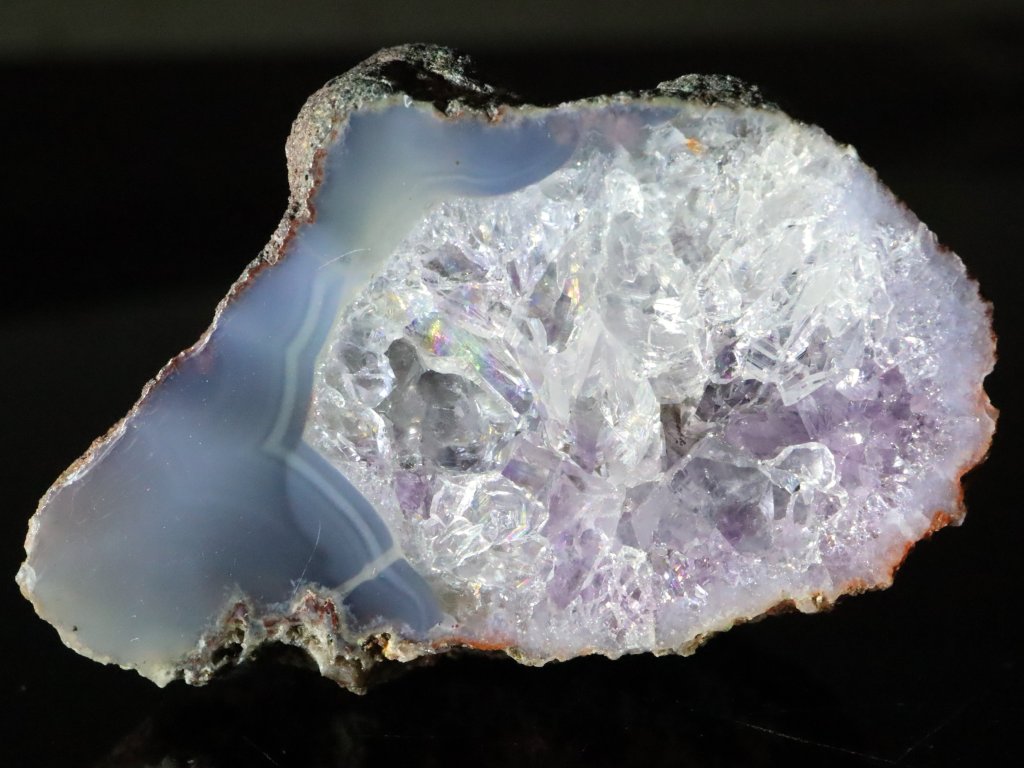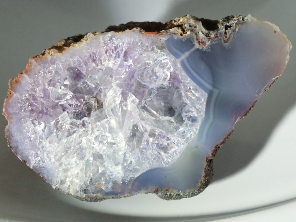 Tento achát má v jednou okraji jemně modrý odstín, většina této pecky je však bohatě vyplněna ledově bílým křišťálem. Pozorovat tu však můžete i vzácné tóny jemně fialového ametystu.