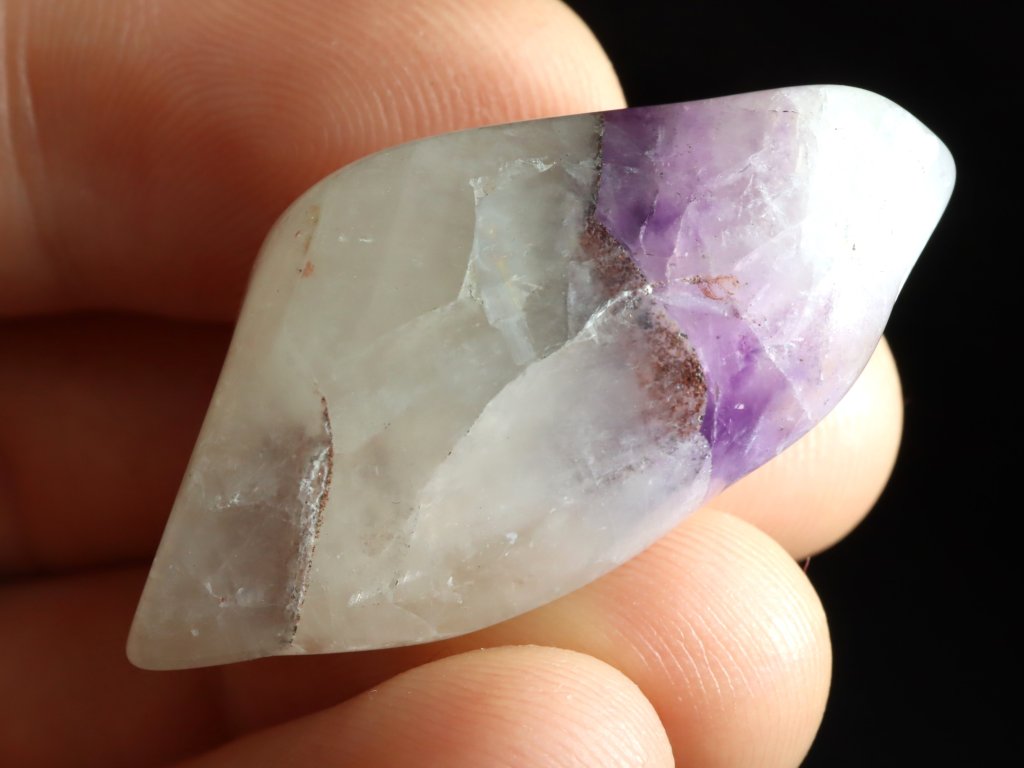 Jde o tromlovaný valounek ametystu ve spojení s mléčným až šedým křemenem.
