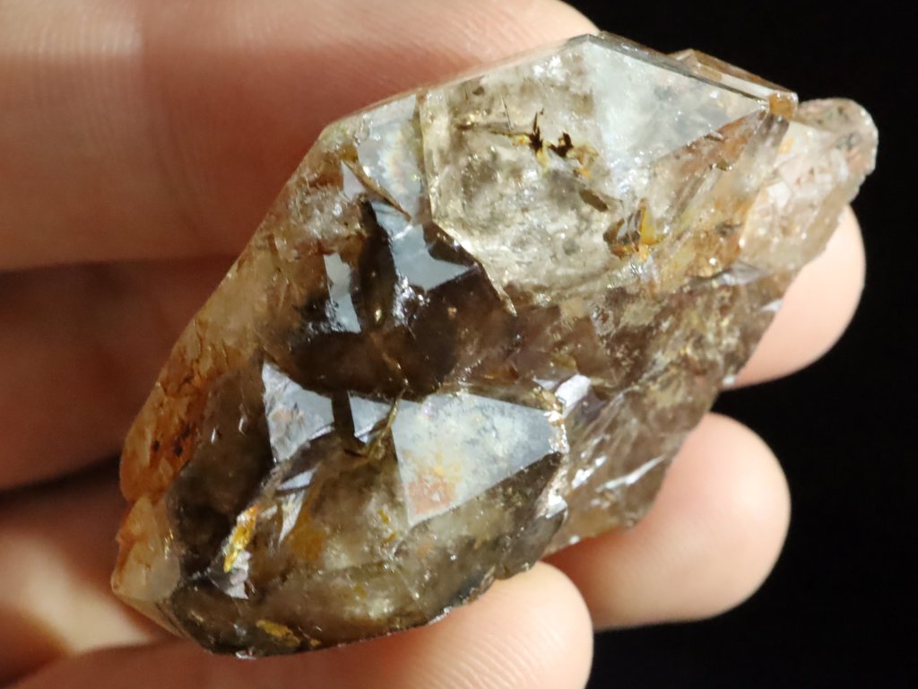 Jedná se o velice pohledný plochý krystal záhnědy, se vzácným elestiálním / stupňovitým růstem a částečným oboustranným vyvinutím.