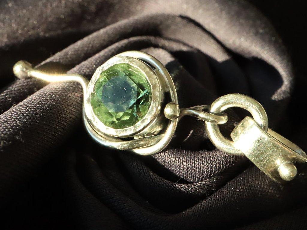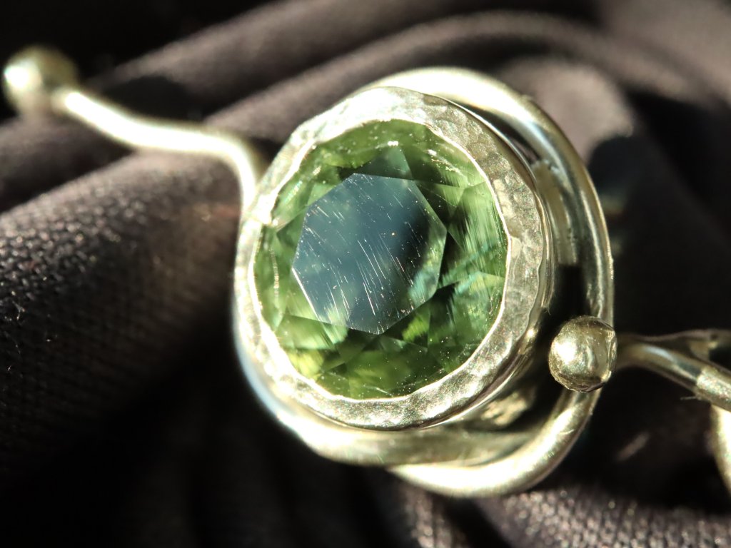 Kulatý broušený vltavín je naším zlatníkem (faserem) precizně usazený do lůžka, kde jej bezpečně obepíná stříbrný kroužek s patinou označovanou jako "starostříbro". Tento kroužek je ještě vkusně opletený stříbrným drátkem s kapičkou / kuličkou stříbra, což dotváří celkový estetický vzhled přívěsku.