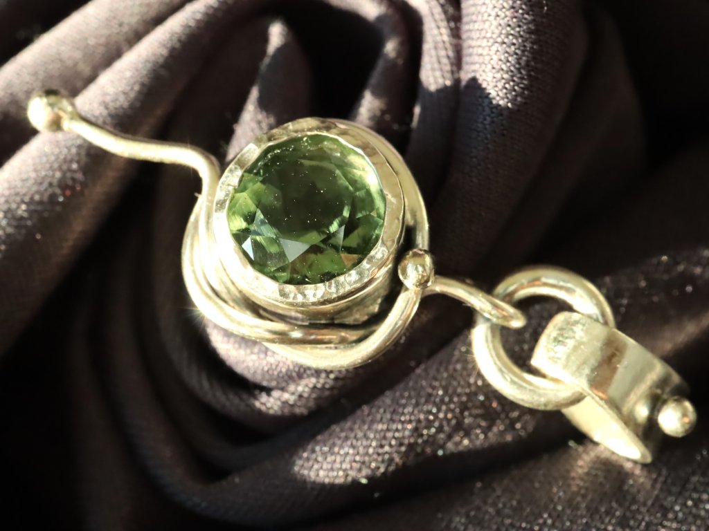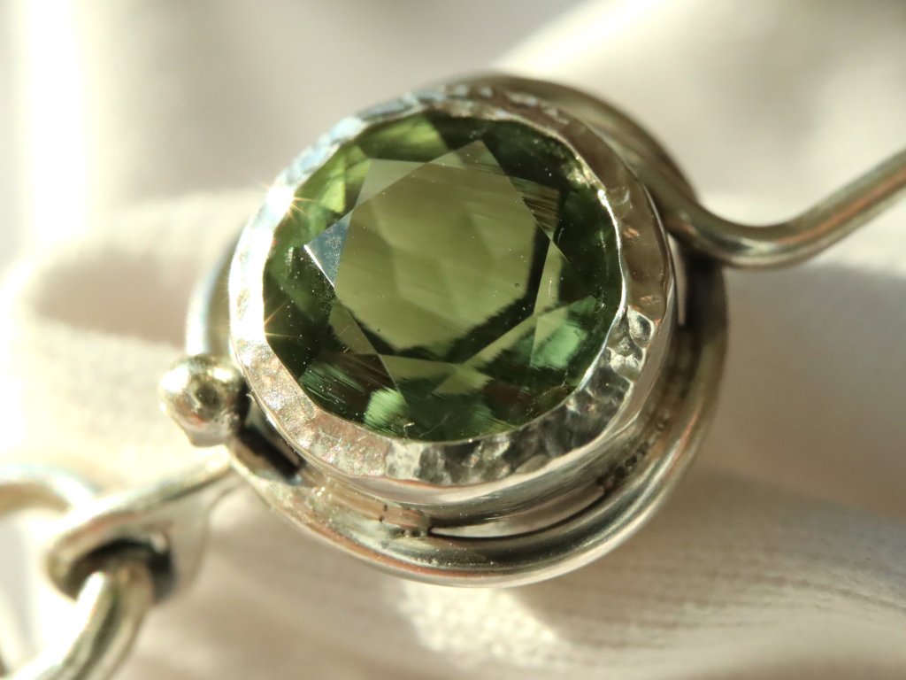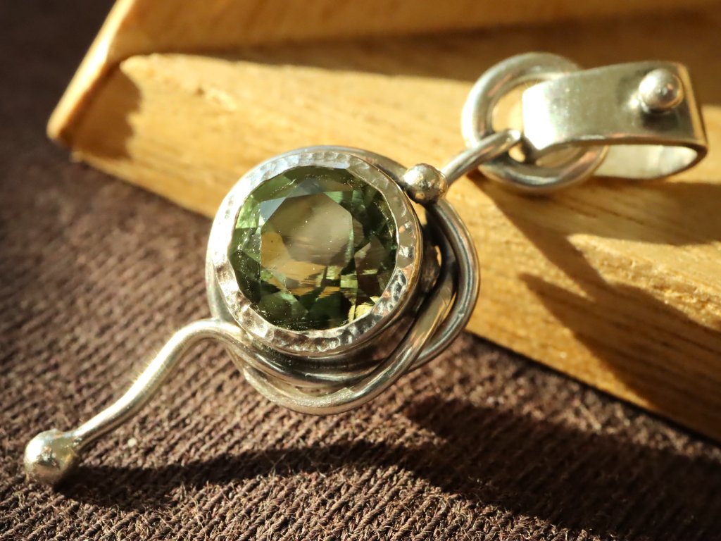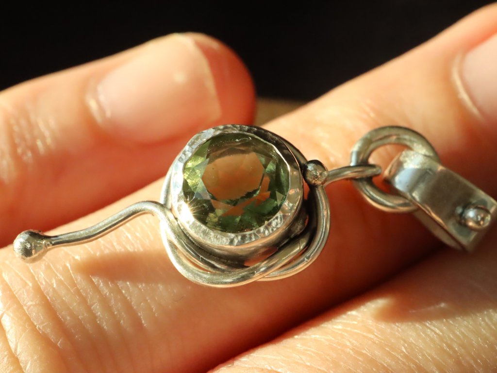 Tento jedinečný přívěsek je ručně zhotovený ze stříbra 925/1000 a je osazený vybroušeným vltavínem ve tvaru kulatého briliantu.