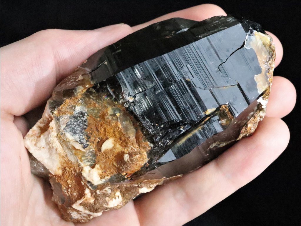 Nejspodnější část krystalu je tvořena šedým křemenem, bílým albitem a tenkým povlakem přírodního hnědo-oranžového limonitu (oxidu železa). Jde o tzv. podložkové nerosty (křemen, albit) neboli mateční horninu, na které tento morion kdysy (před mnoha miliony lety) vyrost, a ze které se vlivem geologických změn podloží odlomil.