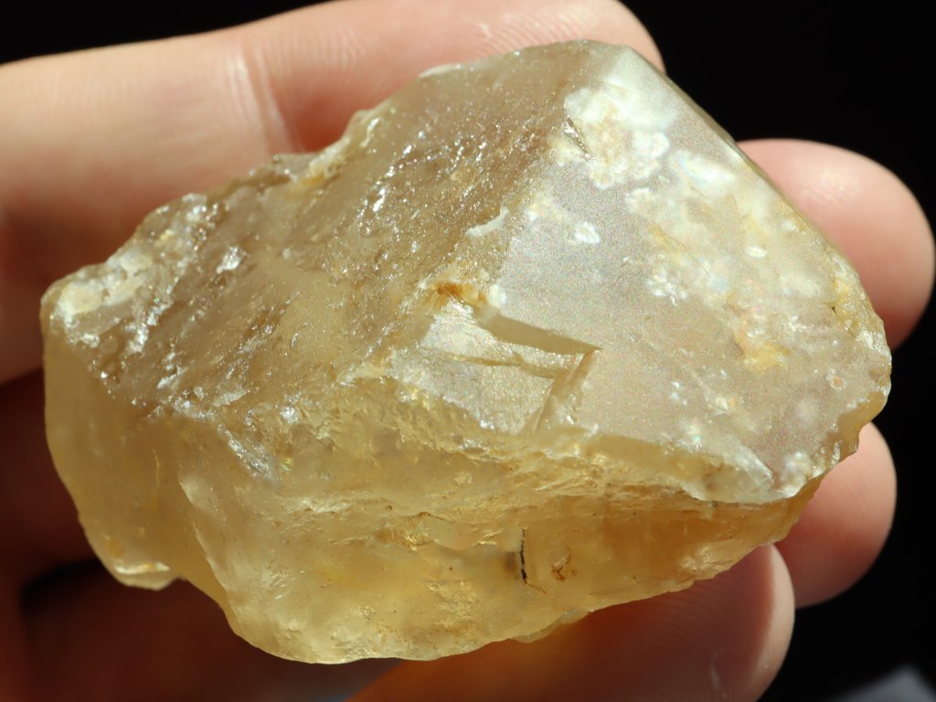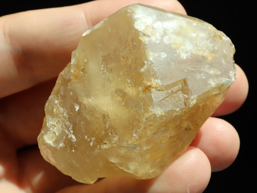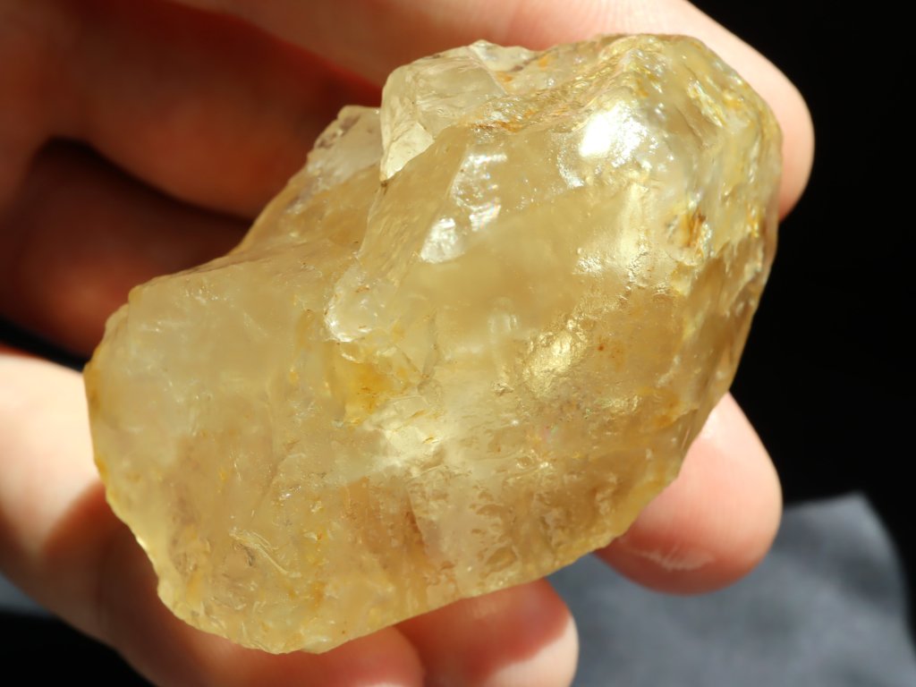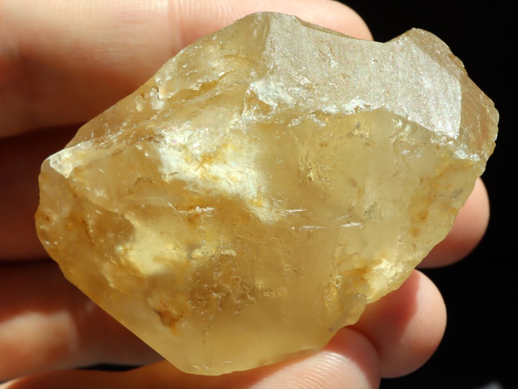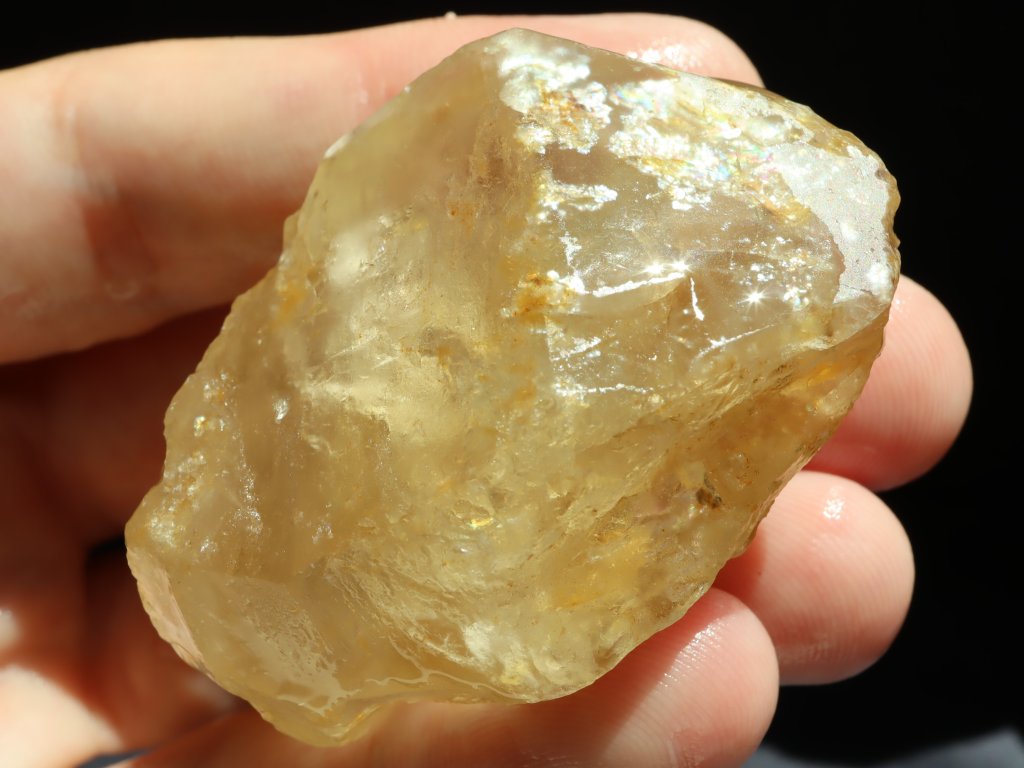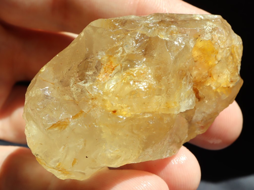 Uvnitř je citrín mírně zakalený a protkaný množstvím inkluzí (peříček, mlhovin). Stále si však zachoval slušnou celkovou vnitřní čistotu, takže je moc hezky průsvitný (sluníčkem či například baterkou).