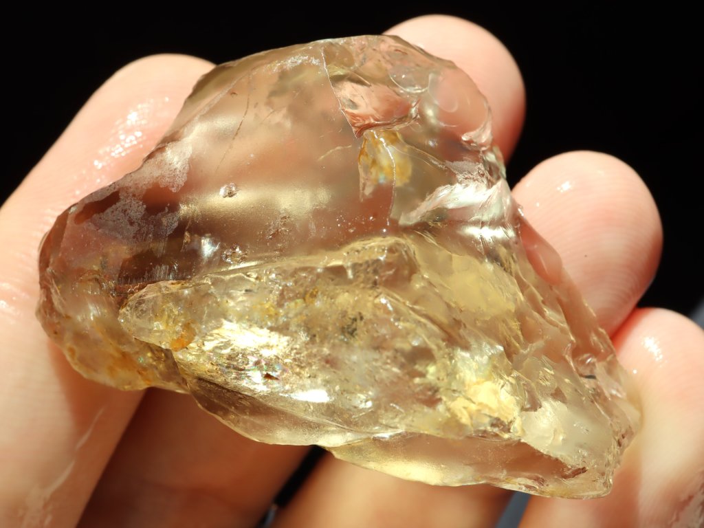 Citrín se však také pyšní docela unikátní barvou, která má na sluníčku jemně žlutý odstín s decentními zlatavými tóny a kouřovou pasáží v pomyslné špici krystalu. Ještě více pak toto jedinečné zbarvení vynikne a zazáří pokud je kamínek mokrý - To je dobře zachyceno na úvodních třech fotografiích, na dalších čtyřech snímcích je pak již citrín suchý.