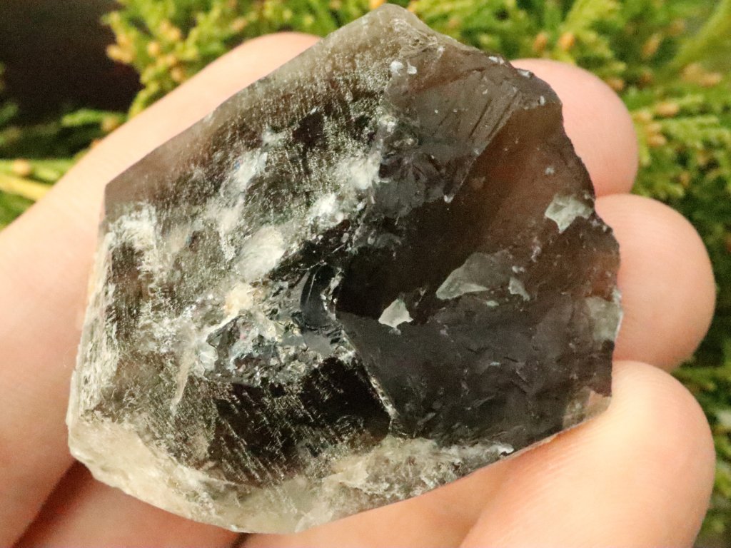 Morion má typickou temnou až černou barvu, místy je pak decentně pokrytý či nepatrně prostoupený mléčným křemenem. Najdete tu však i kousek sněhově bílého albitu nebo zarostlý lupínek muskovitu / stříbrné slídy.