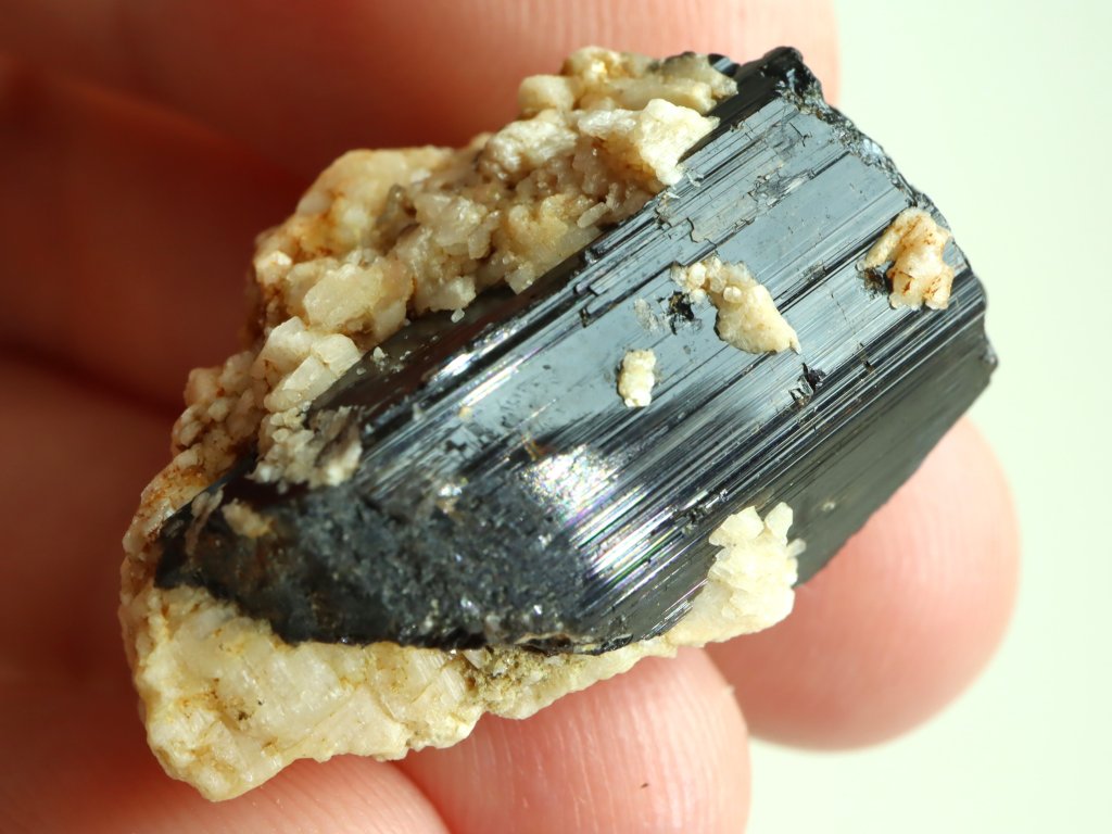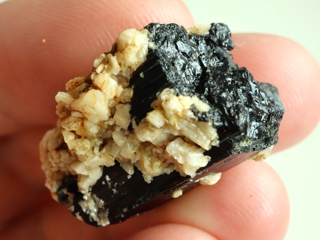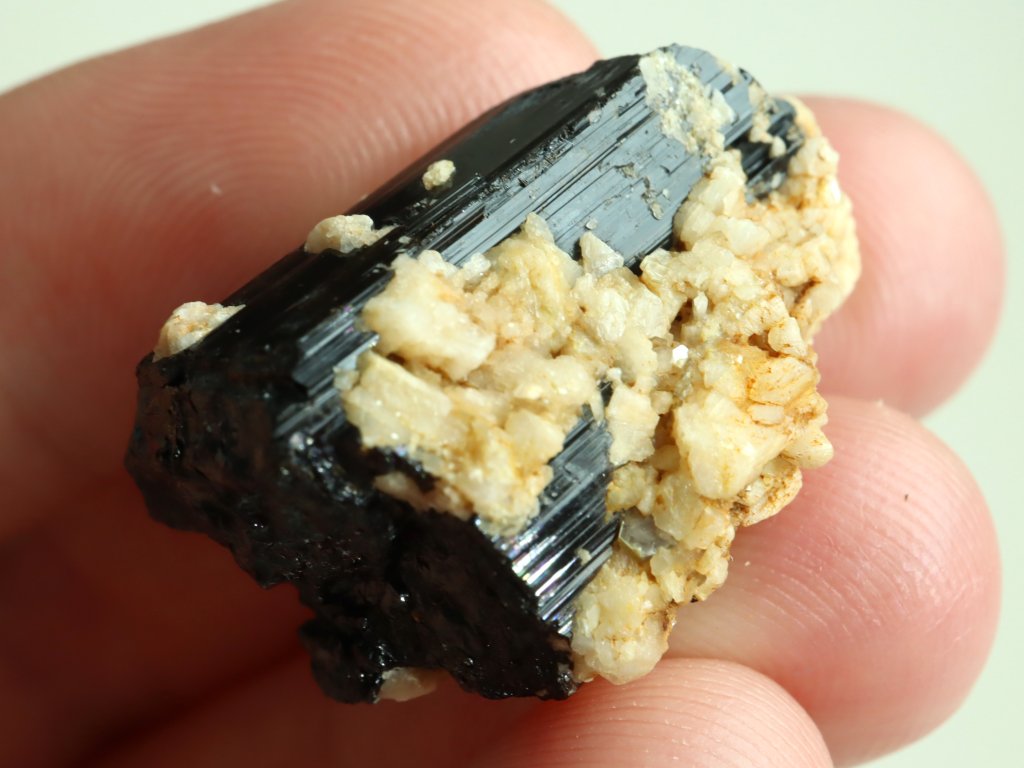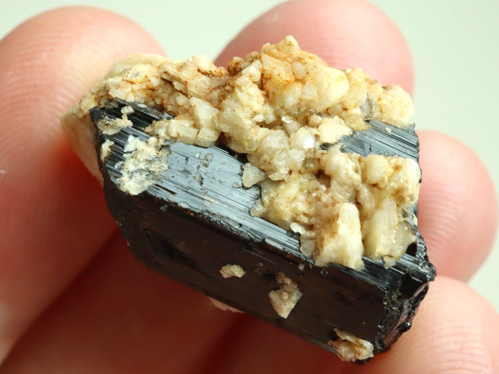 Černý turmalín skoryl vypadá dobře i jako samostatný váleček, tento kousek, který je však v hezké kombinaci s mateční horninou albitem, však působí daleko zajímavěji a originálněji.