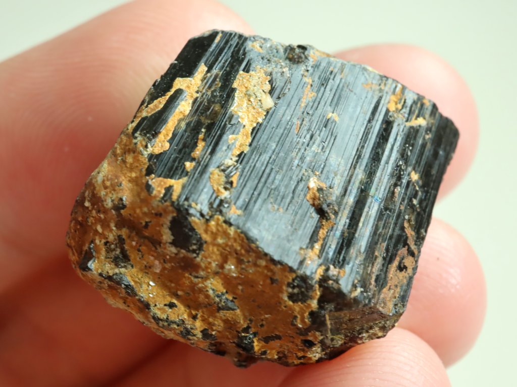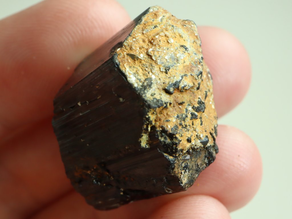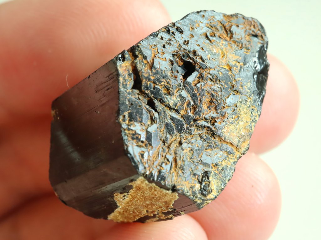 Slušný 20-ti gramový váleček černého turmalínu, který se z jedné čelní strany může pochlubit hezkým dohojením. To je tradičně tvořeno množstvím drobnějších plošek - viz. úvodní snímek.