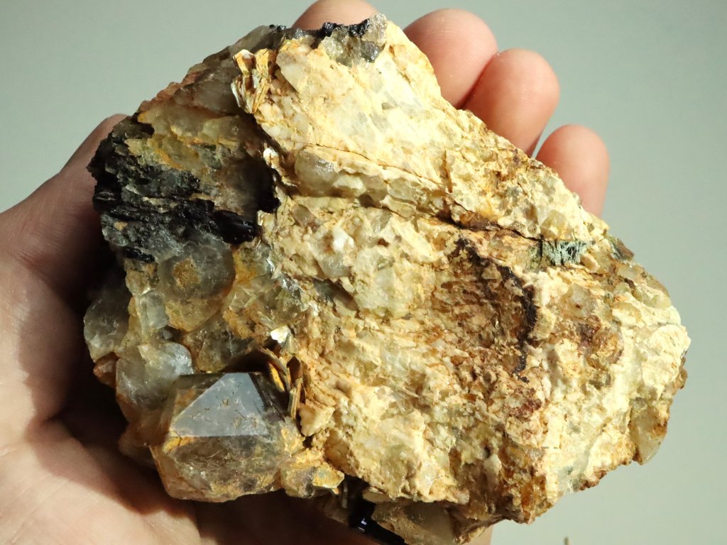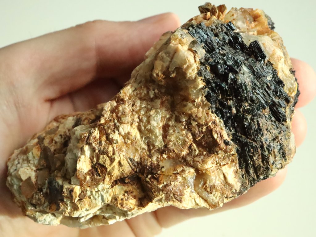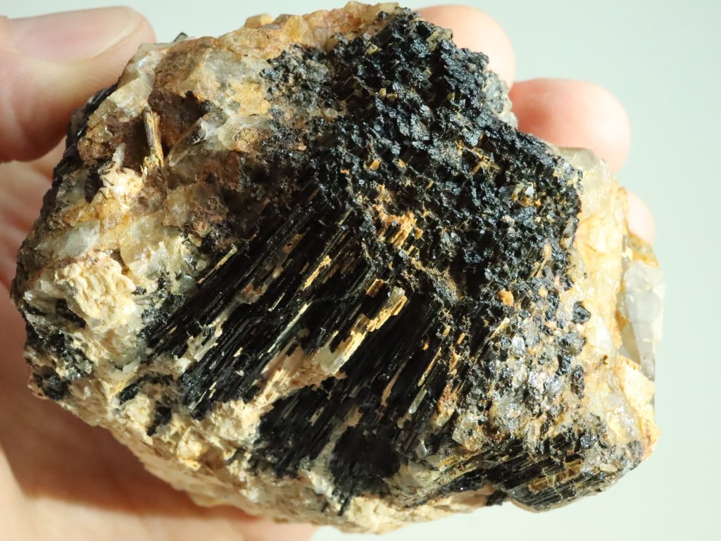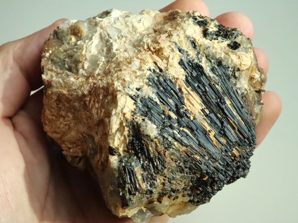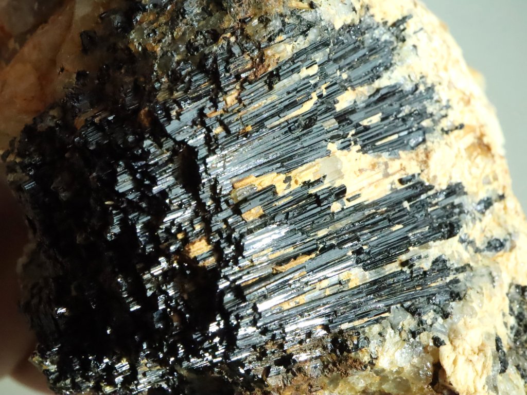 Dominantou je zde zarostlý velký černý turmalín skoryl s tzv. jehlicovitým růstem - Turmalín zde tvoří jeden celek, ale pokud se pozorněji podíváte, zjistíte, že jej tvoří množství drobných tenkých jehlic (Tento specifický růst se u skorylů vyskytuje poměrně vzácně).