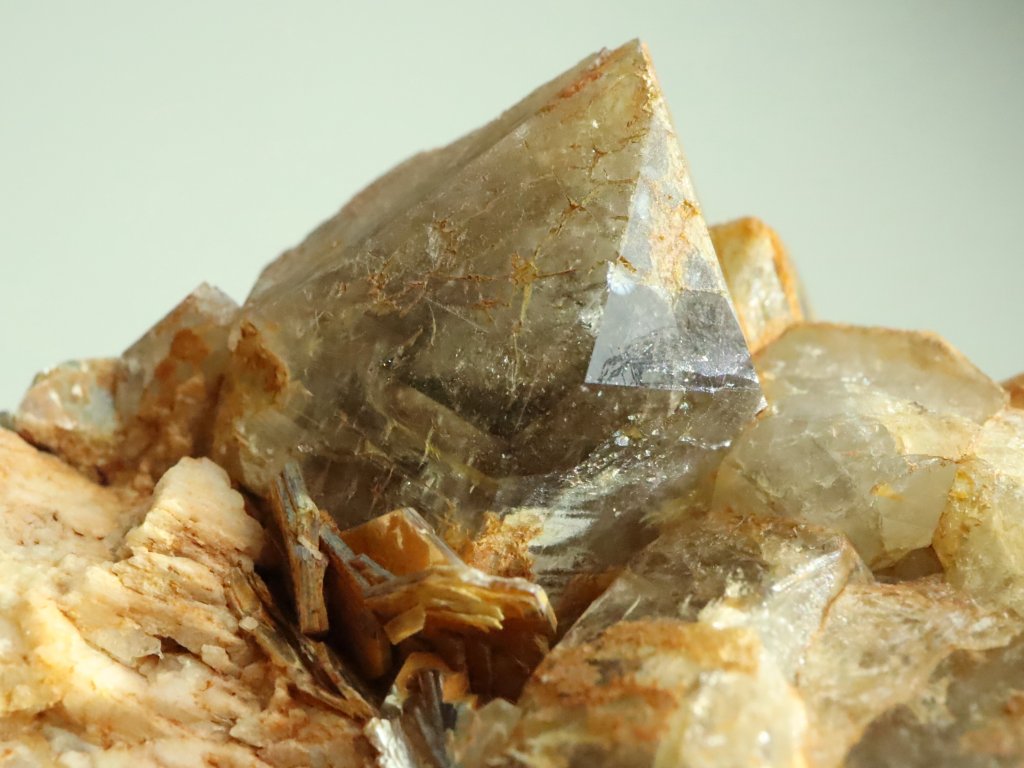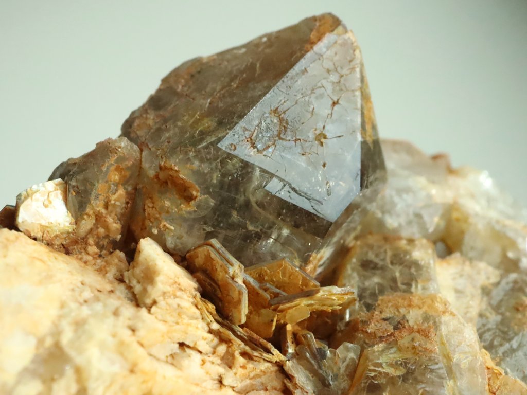Jako druhý vás pak zaujme krystal / špička kouřové záhnědy. Ta je moc hezky zachovalá a má vedle sebe i malinkého "bratříčka" - přirostlý další drobný krystalek záhnědy. Opodál je pak ještě malý špalíček dalšího černého turmalínu a několik estetických lupínků stříbrné slídy - odborně muskovitu.