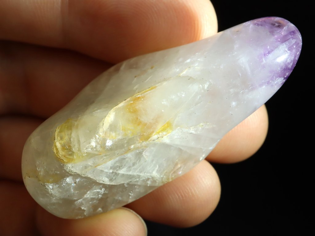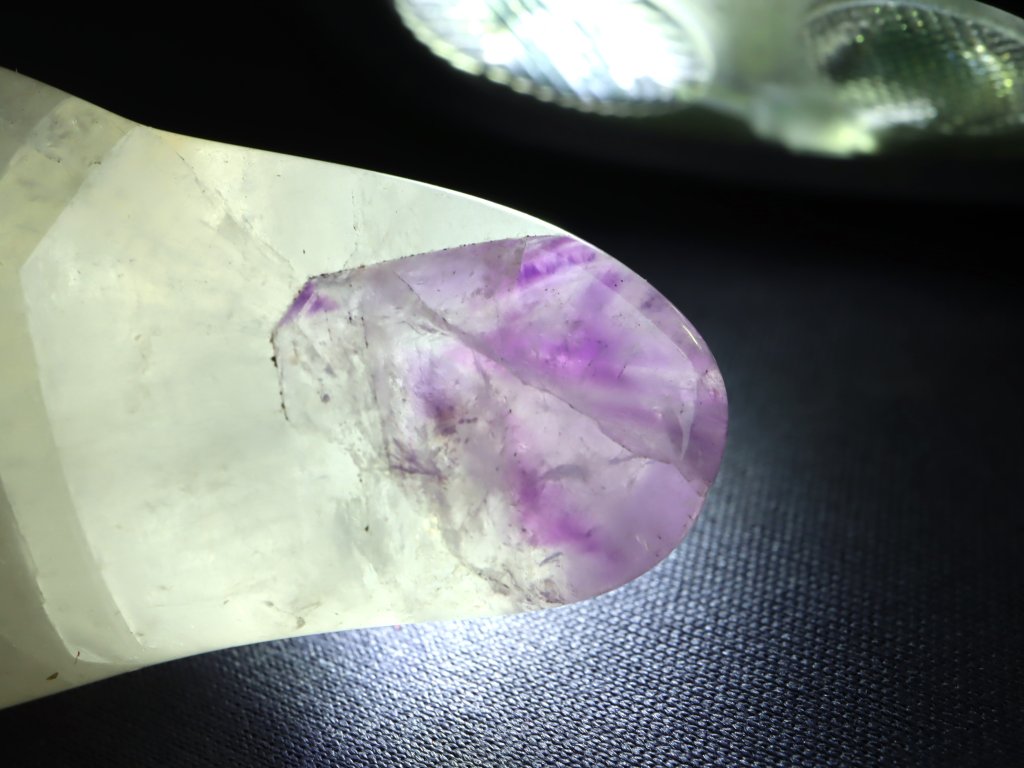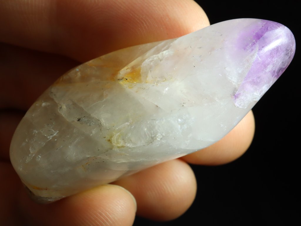 Jde o tromlovaný valounek ametystu ve spojení s mléčným křemenem a lehce i čirým ledovým křišťálem.