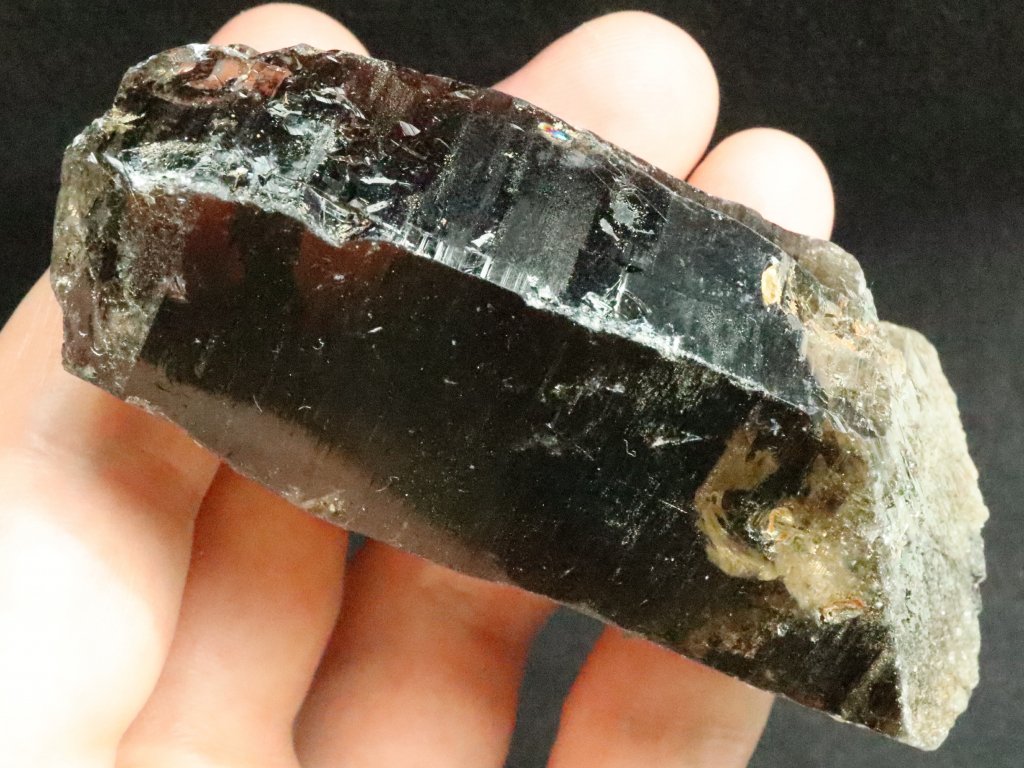 Jedná se o slušně velký fragment Mistrovského krystalu morionu (Samoléčitele) s drahokamovou vnitřní čistotou (kámen vhodný i na brus), fantastickou barvou a přirostlým drobným skorylem.