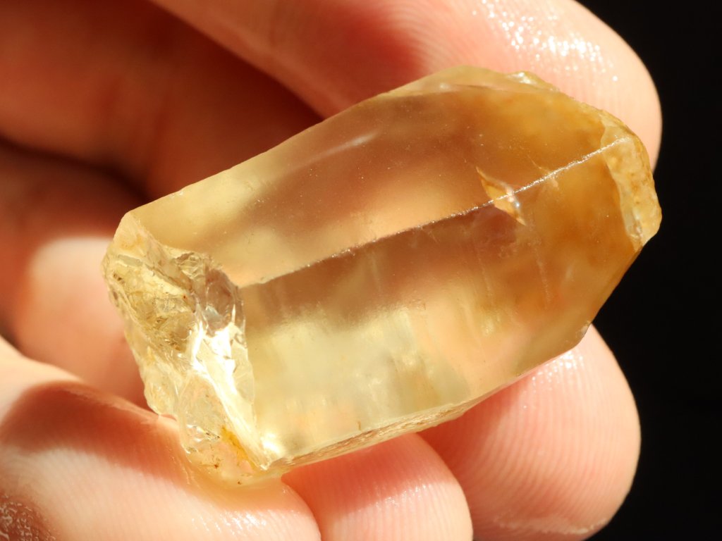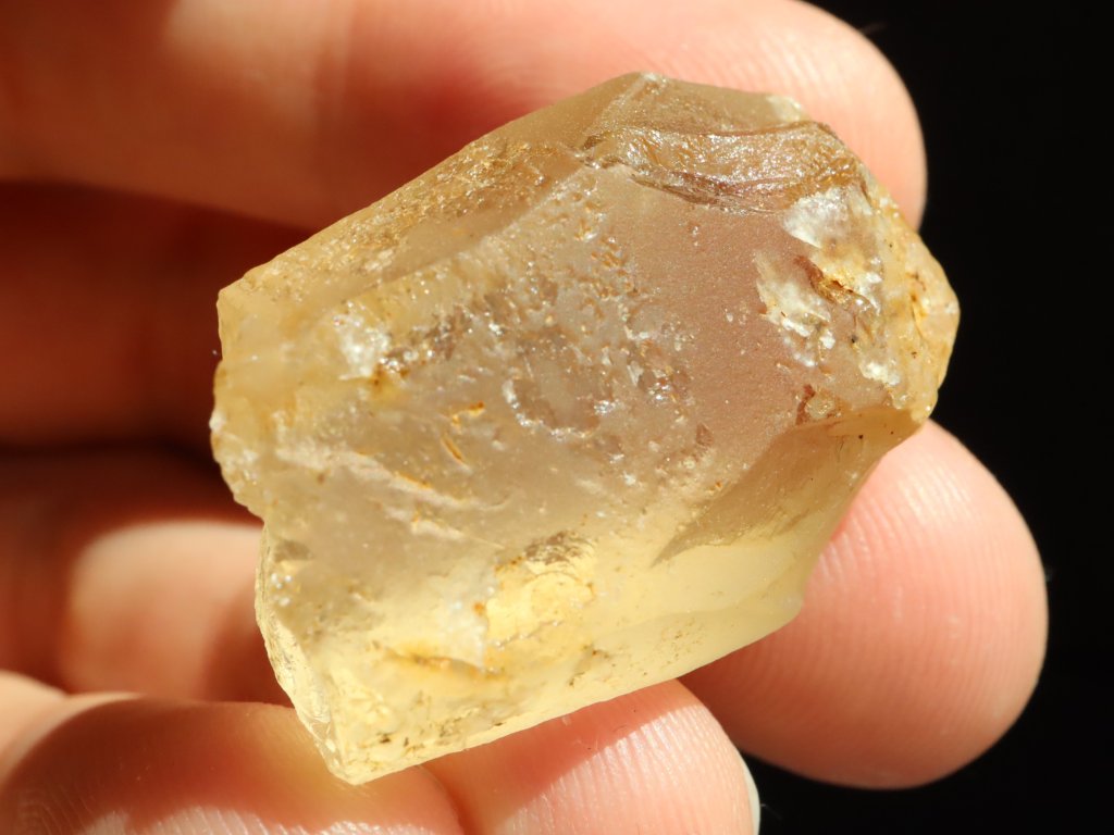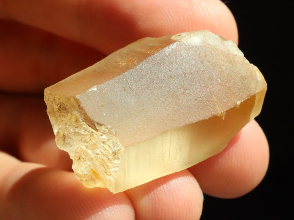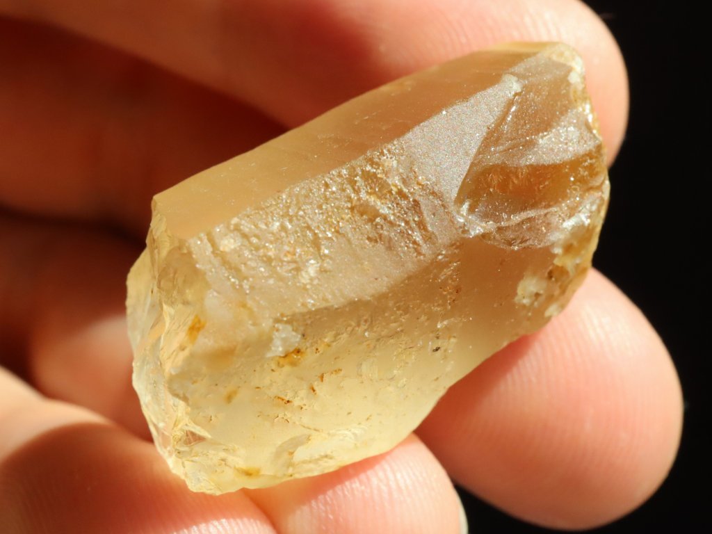 Sluníčkem či baterkou je citrín celý skvěle průsvitný, matný povrch však nedovoluje nahlédnout do vnitřního světa kamínku. I přes to je však celkem jasně patrné, že tento fragment ukrývá vysokou tzv. drahokamovou čistotu.