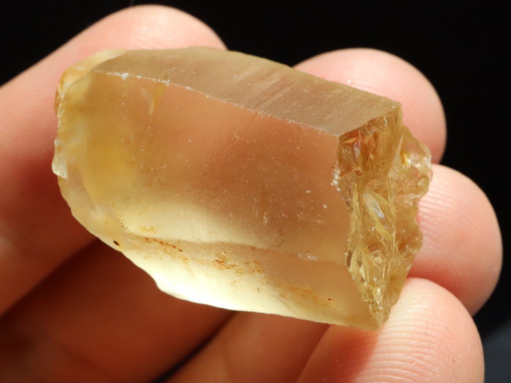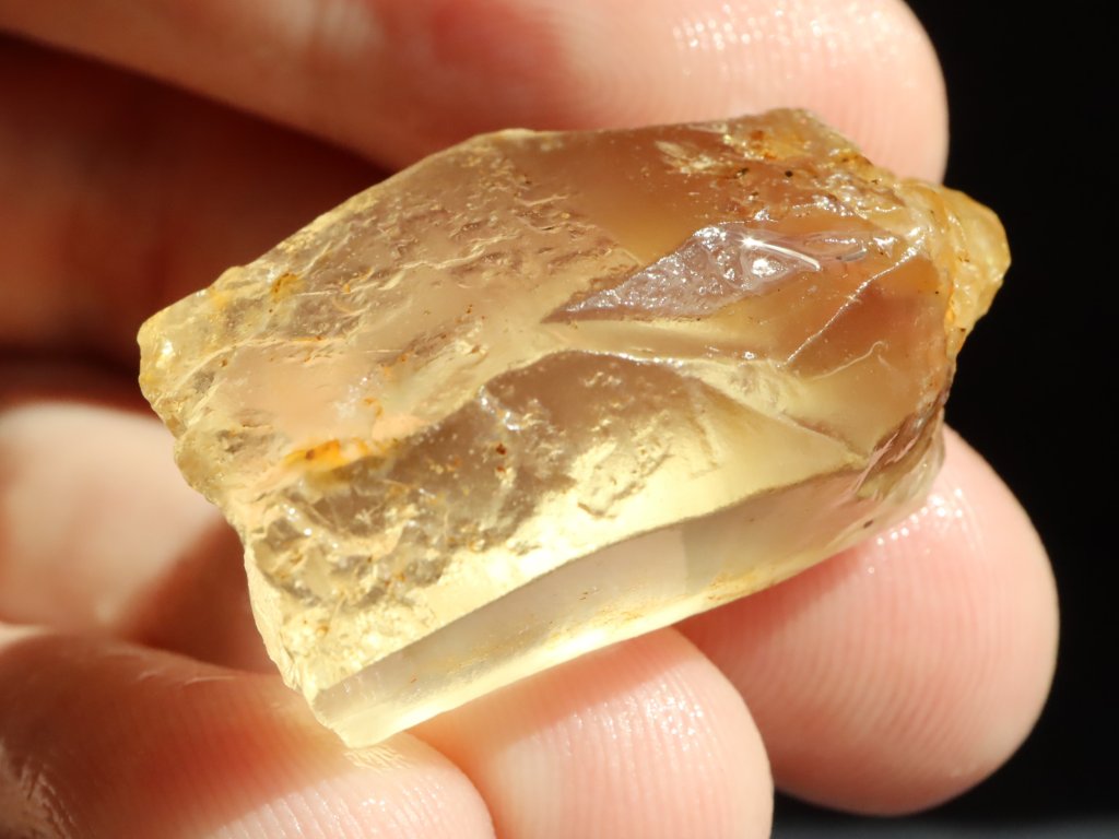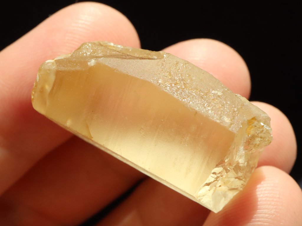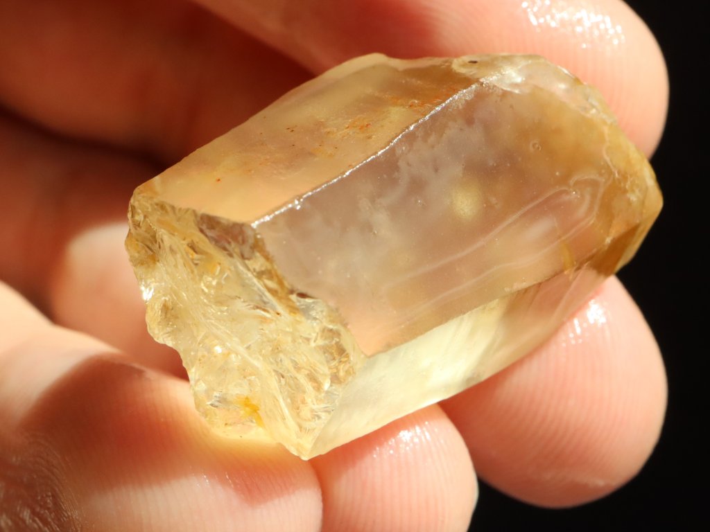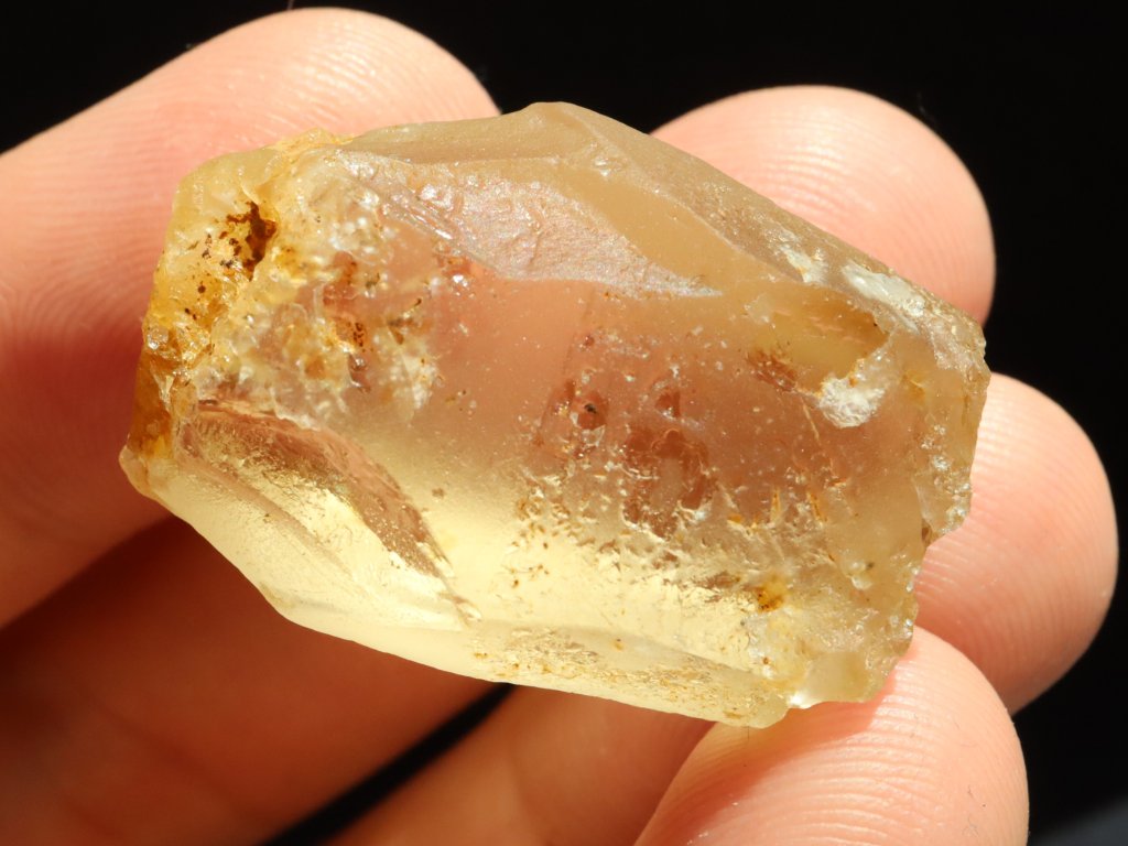 Sluníčkem či baterkou je citrín celý skvěle průsvitný, matný povrch však nedovoluje nahlédnout do vnitřního světa kamínku. I přes to je však celkem jasně patrné, že tento fragment ukrývá vysokou tzv. drahokamovou čistotu.