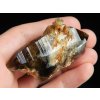 Povrch záhnědy je převážně krásně lesklý, takže pokud krystal prosvítíte sluníčkem nebo lépe baterkou, můžete místy i lehce nahlédnout dovnitř kamene a pozorovat tak nejen slušnou čistotu, ale také různé úkazy jako mlhoviny či peříčka. Prosvícení kamínku je alespoň čátečně zachyceno na posledních čtyřech fotografiích.
