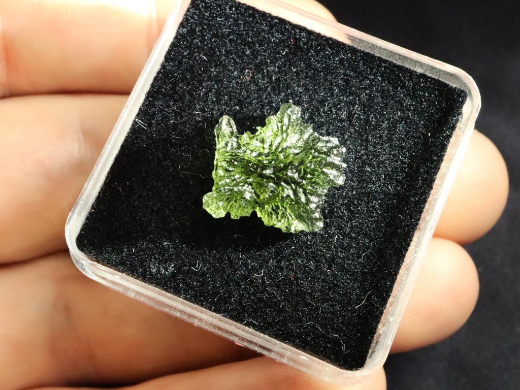 Vltavín obdržíte v kvalitní (hodnotné) uzaviratelné průhledné plastové krabičce s polstrovaným vnitřkem - viz. foto. Kamínek se vám tak nejen nikam nezatoulá, ale zároveň se jím budete moci přes průhledné plastové víčko krabičky i skvěle kochat.