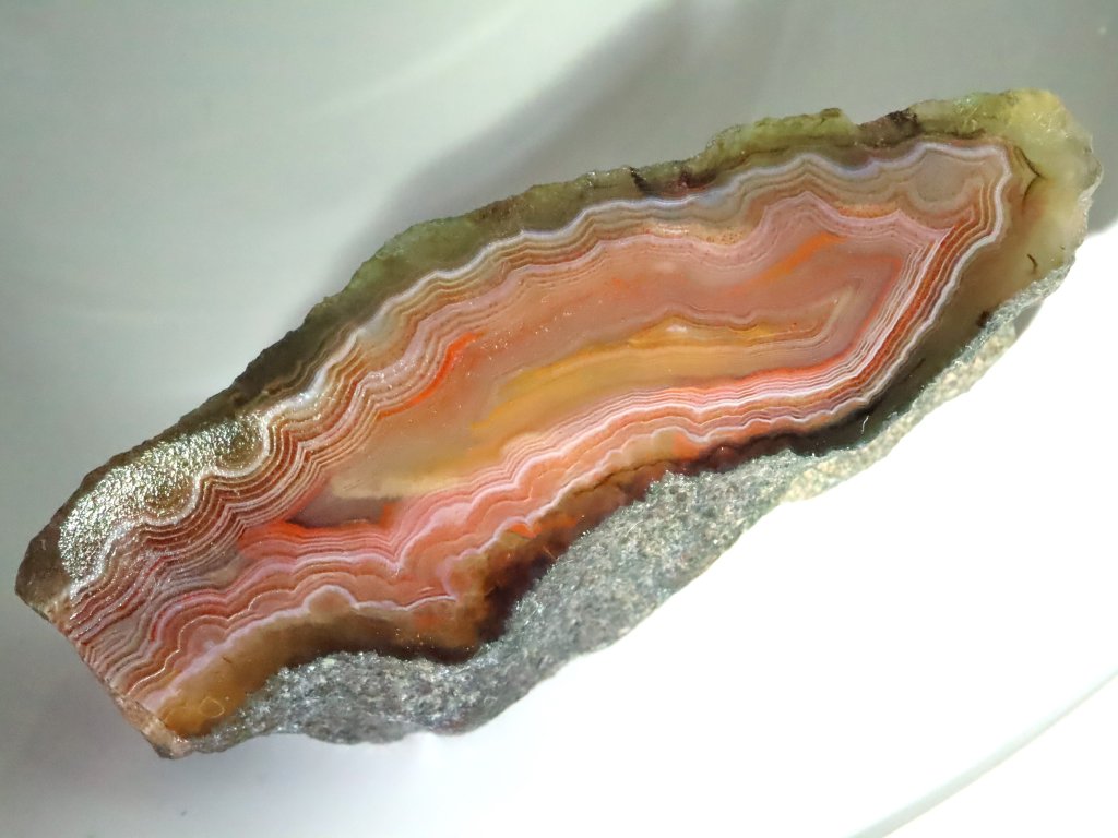 Polovina / fragment achátu z Doubravice (ČR), který zaujme velmi krásnou a zároveň jemnou kresbou, ale také půvabnou červeno-oranžovou barvou.