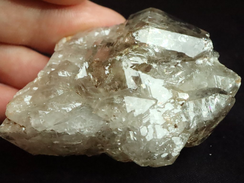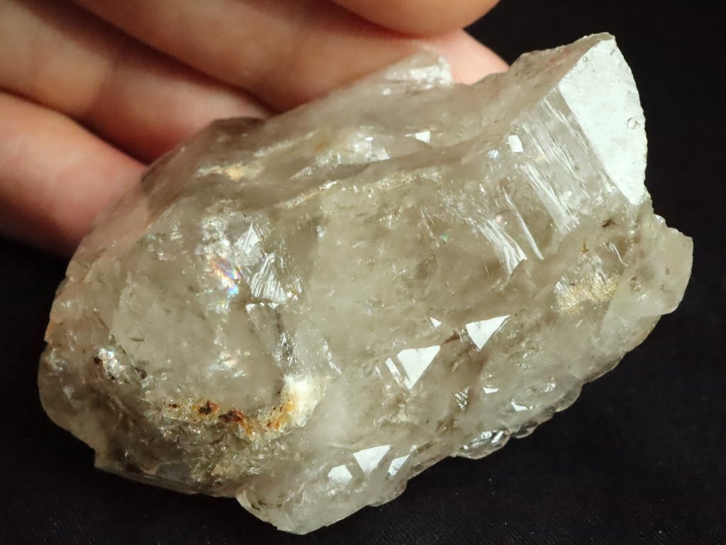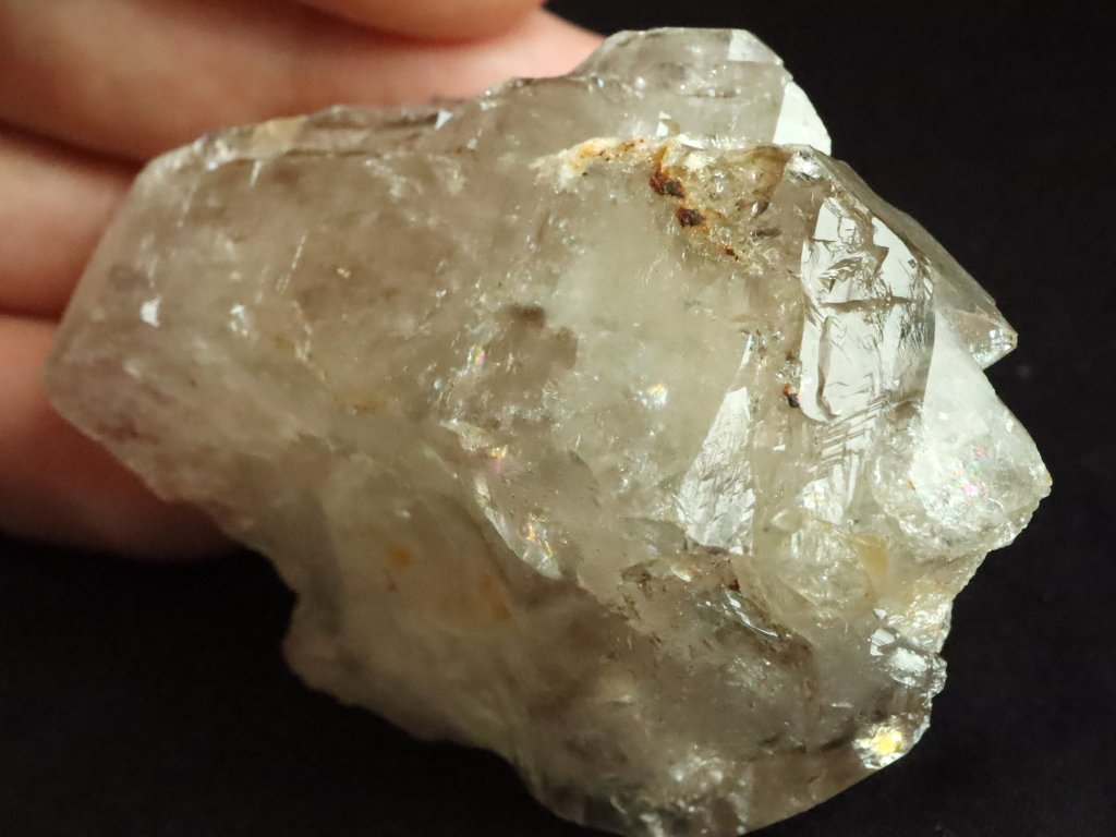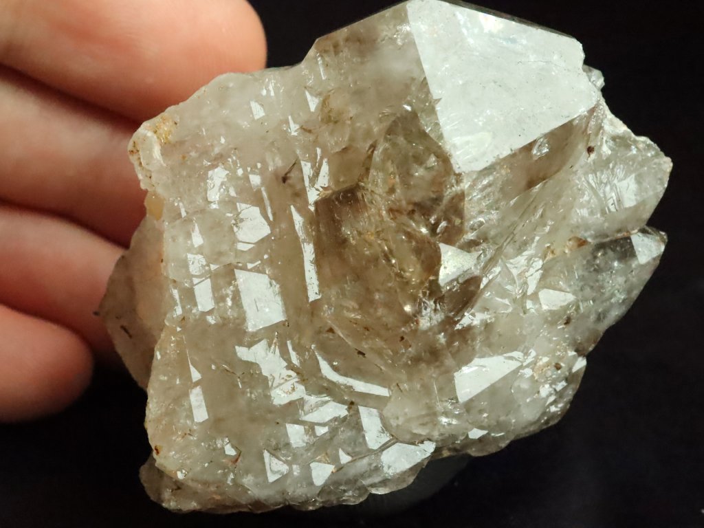 Krystal záhnědy je lesklý, sluníčkem či baterkou částečně průsvitný a uvnitř decentně zakalený mléčným křemenem.