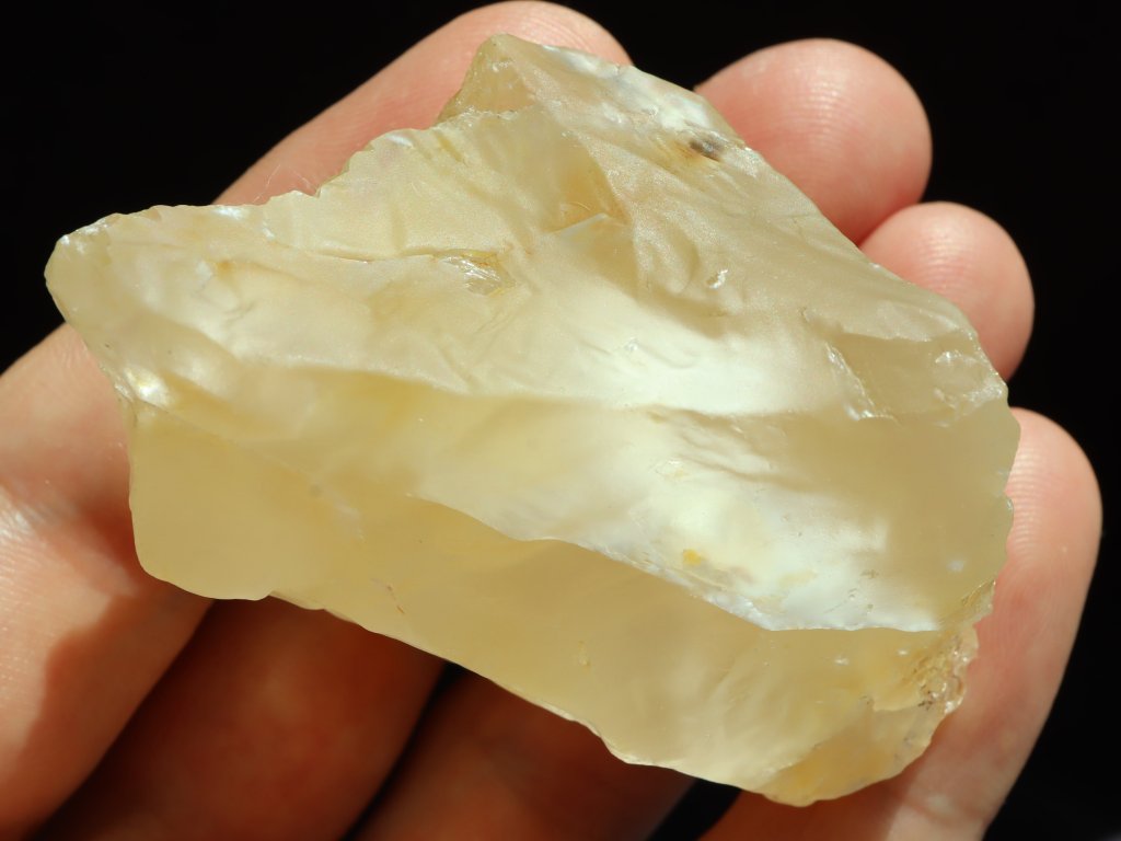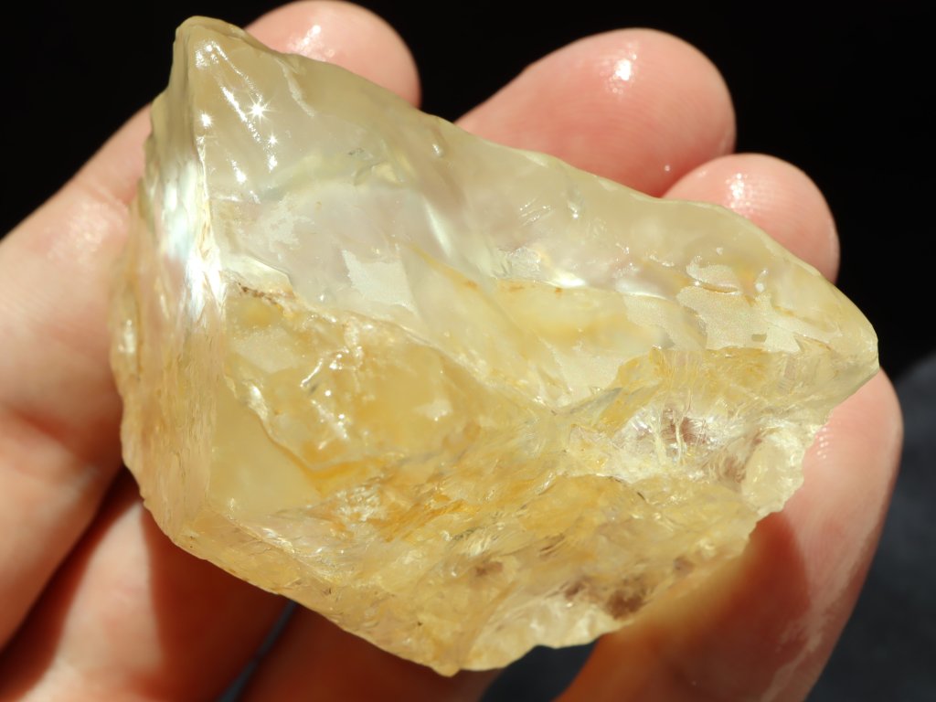 Jde o slušný kousek citrínu, který na sluníčku zaujme přirozeným jemně / světle žlutým odstínem. Jelikož je povrch kamene převážně matný, nejvíce citrín vynikne a zazáří když je na sluníčku a navíc mokrý - To jsme pro vás zachytili na úvodních třech fotografiích (celkem je u vzorku 8 snímků).