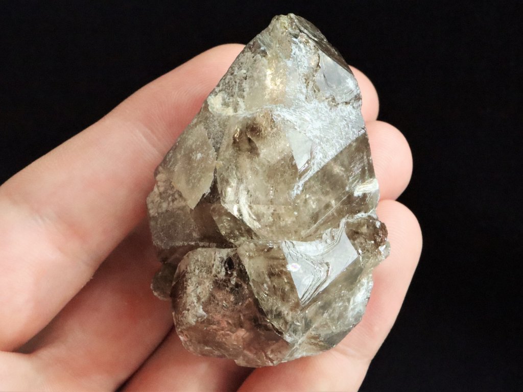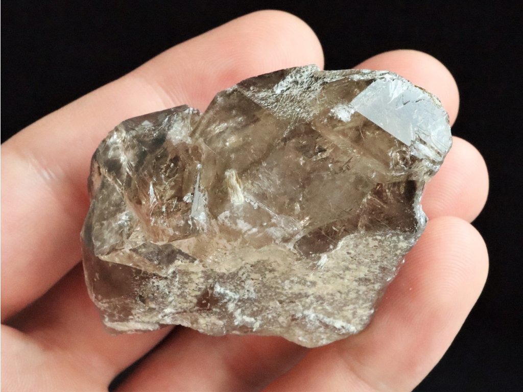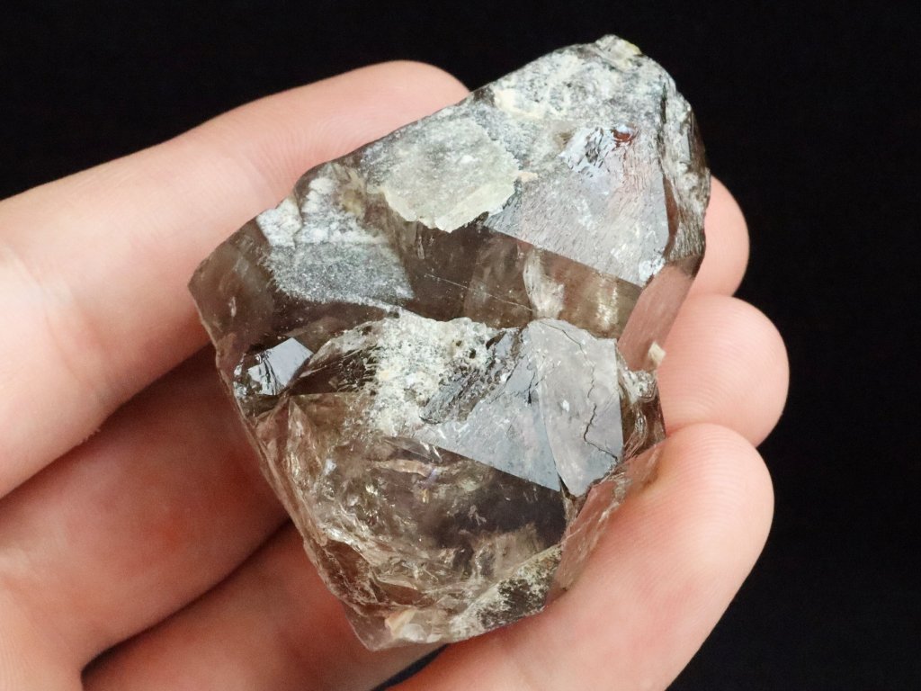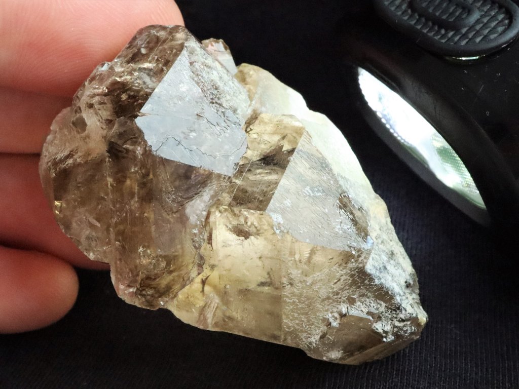 Záhněda je z jedné strany moc pěkně půsvitná (sluníčkem nebo baterkou) a dovolí i mírně nahlédnout dovnitř. Mlhoviny, inkluze, peříčka a barevné duhy zde jistě každého nadchnou.