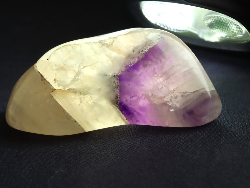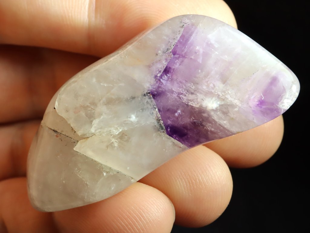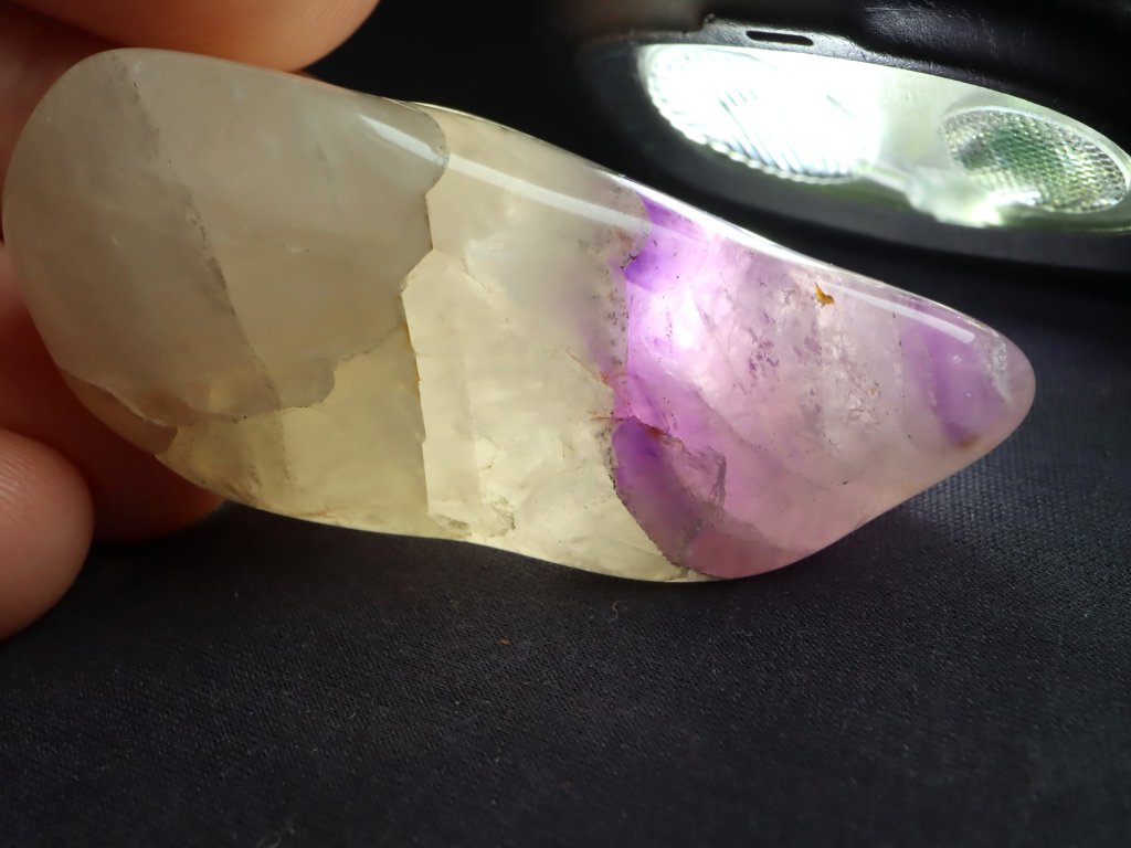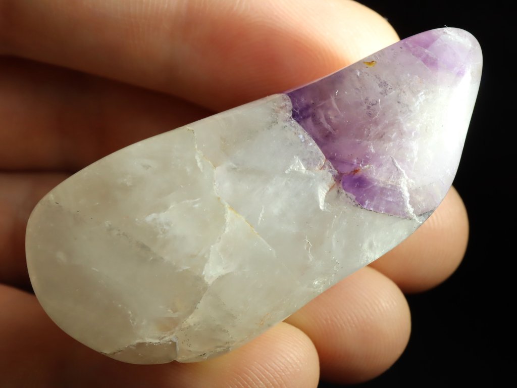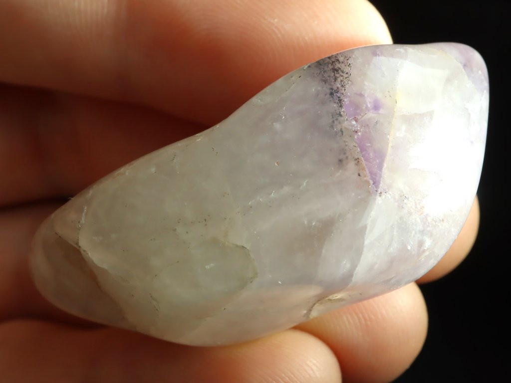 Jde o tromlovaný valounek ametystu ve spojení s mléčným křemenem a lehce i čirým ledovým křišťálem.