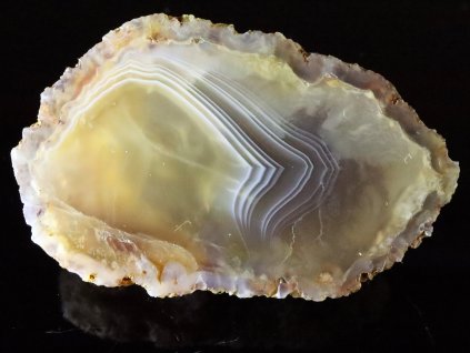 Jedná se o menší ukázku tzv. achátové pecky respektive její části (půlky). Celá achátová pecka totiž vypadá jako poměrně nevzhledná hrouda hlíny a její přírodní krása vynikne až pokud ji seříznete a důkladně vyleštíte.