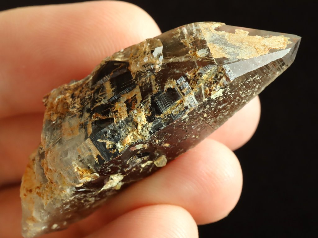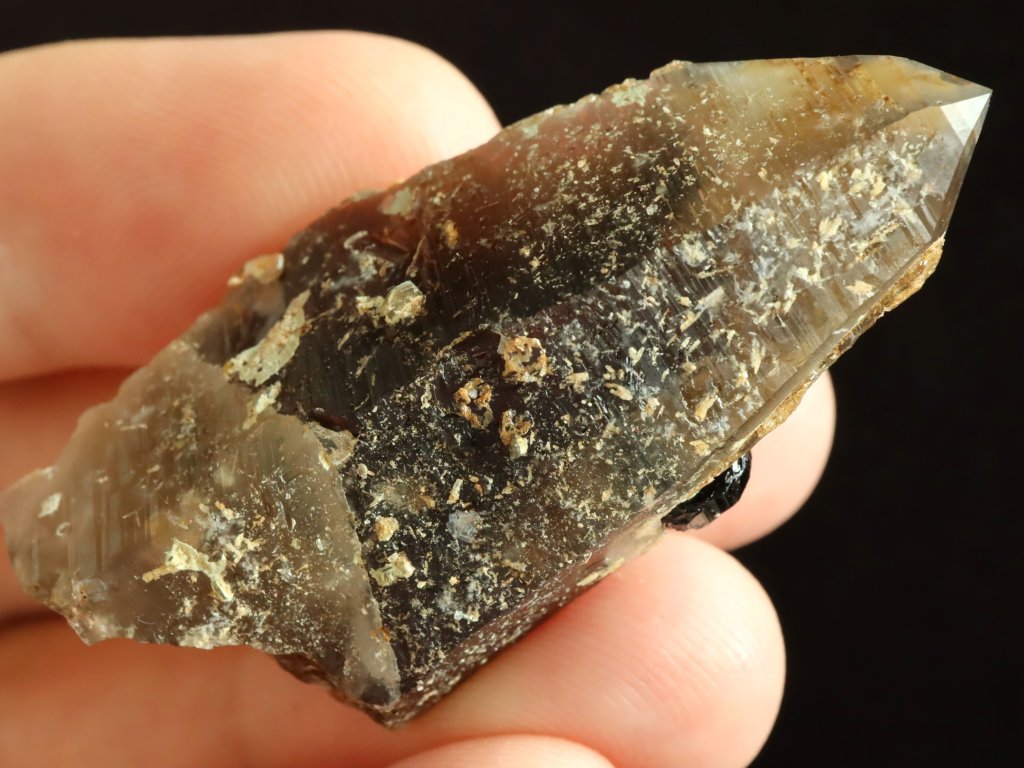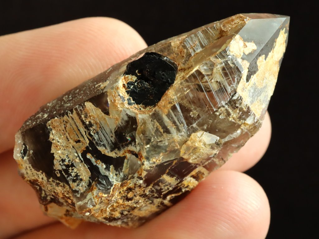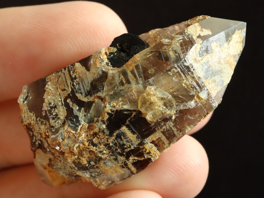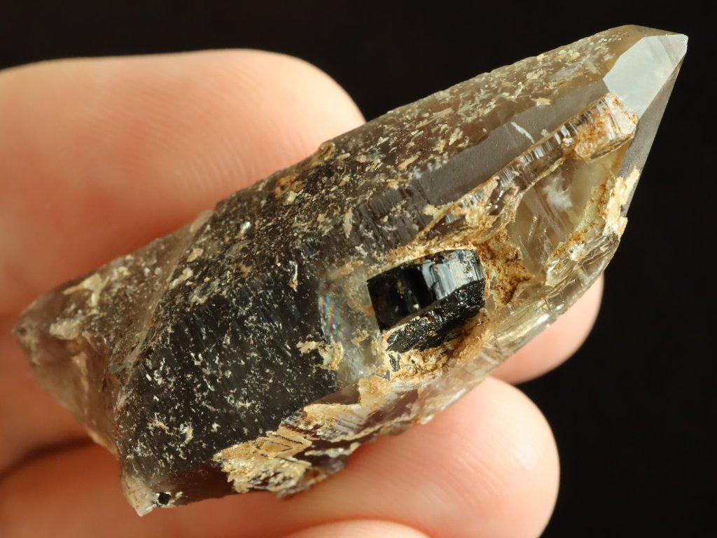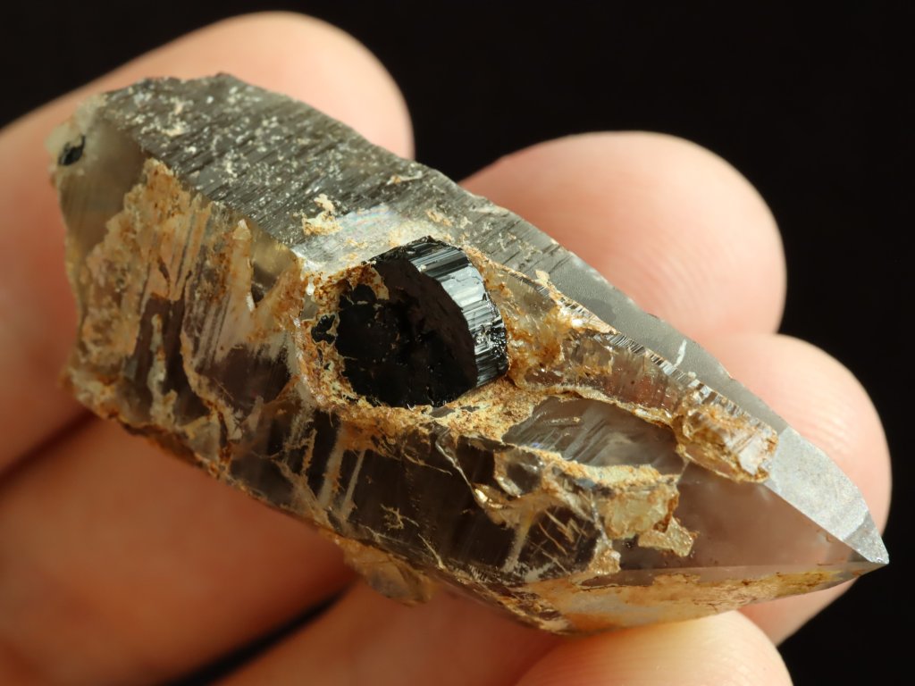 Krásně zachovalý krystalek záhnědy / morionu se zarostlým skorylem