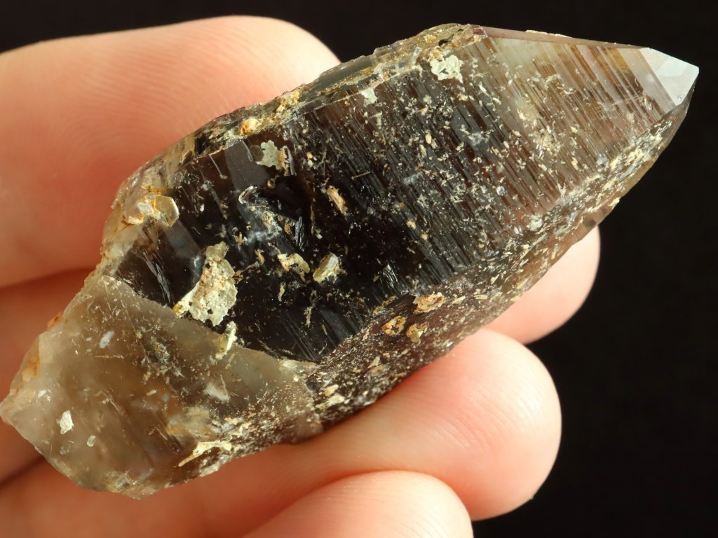 Jedná se o prakticky dokonalý a nepoškozený krystal s délkou téměř 5 centimetrů, který se svým zbarvením řadí někde na pomezí klasické záhnědy a vzácné černé záhnědy označované jako morion.
