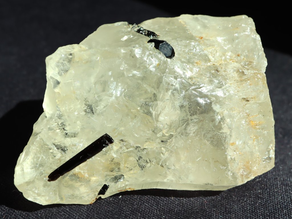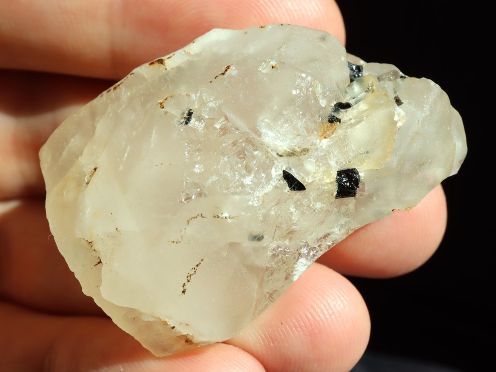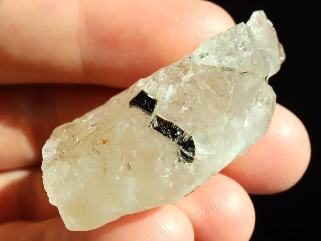 Unikátní na tomto křišťálu jsou však především zarostlé drobné černé turmalínky. Malinkých kousků turmalínů je zde hned několik, za zmínku však stojí hlavně dva z nich a sice jeden protáhlý a úzký tzv. jehlicovitý a druhý je drobný špalíček s ukončením.