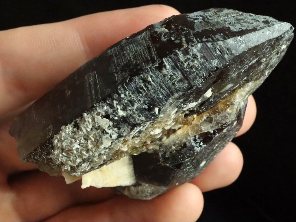 Krystal / srostlice černého morionu s albitem a muskovitem