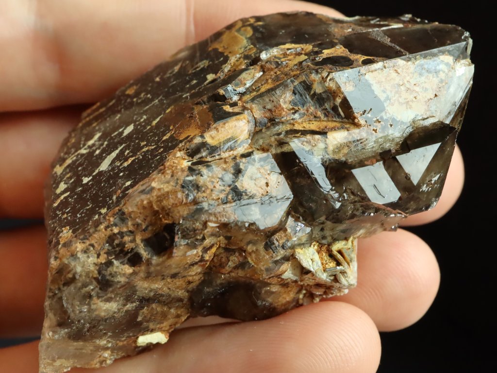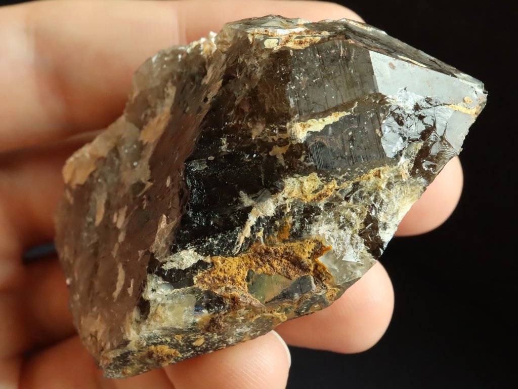 Tento krystal se svým zbarvením řadí na pomezí temně kouřové záhnědy a černého morionu.