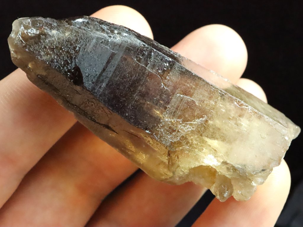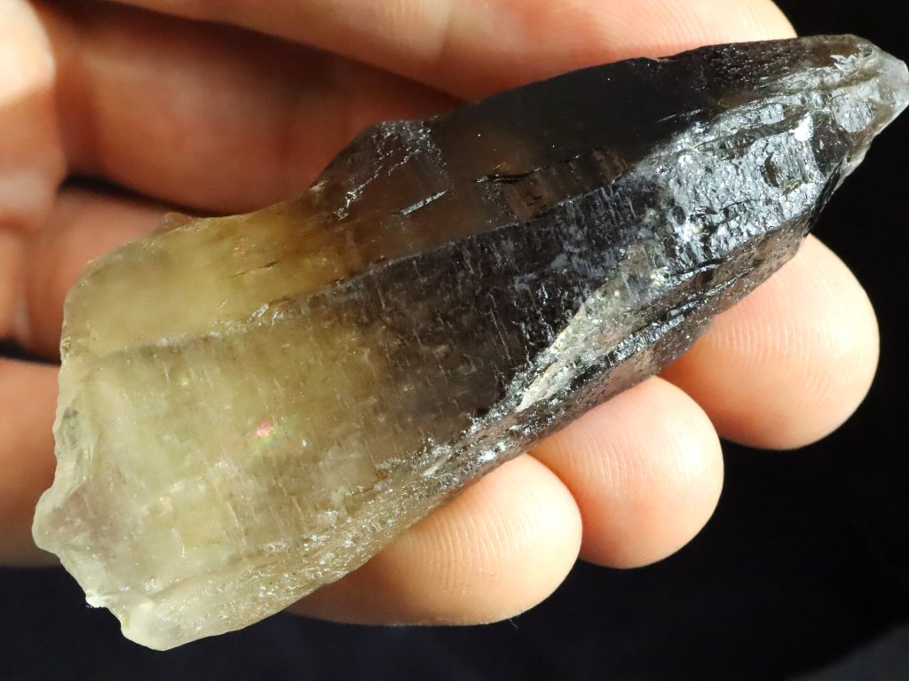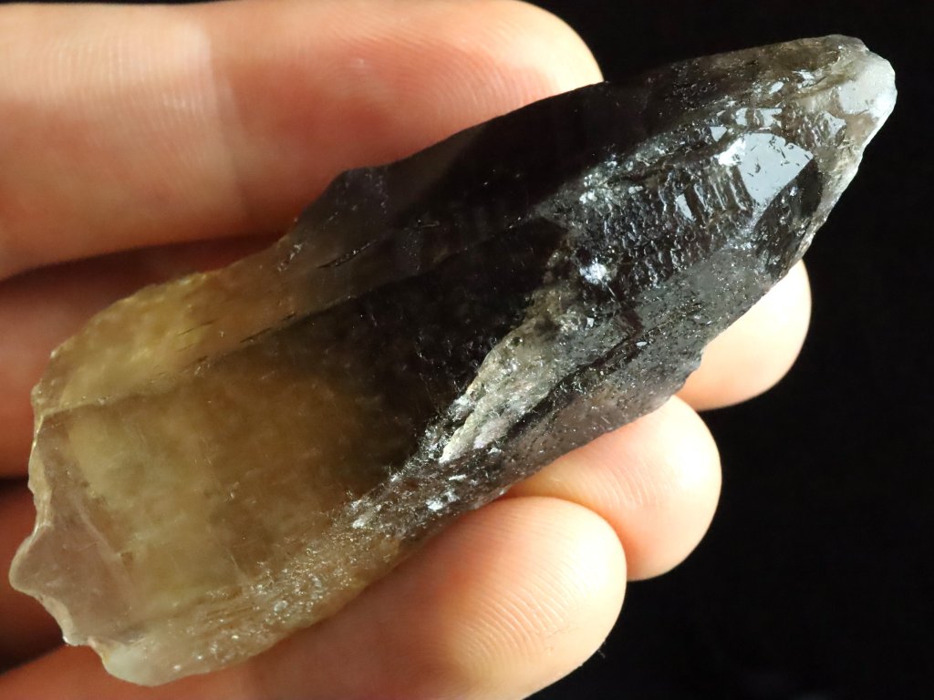 Svým zbarvením lze tento vzorek označit jako morion se záhnědou. Horní polovina krystalu je na běžném denním světle / ve stínu velmi temně hnědá až takřka černá. Spodní polovina krystalu má pak jemně hnědý až kouřový odstín doplněný žlutými tóny.