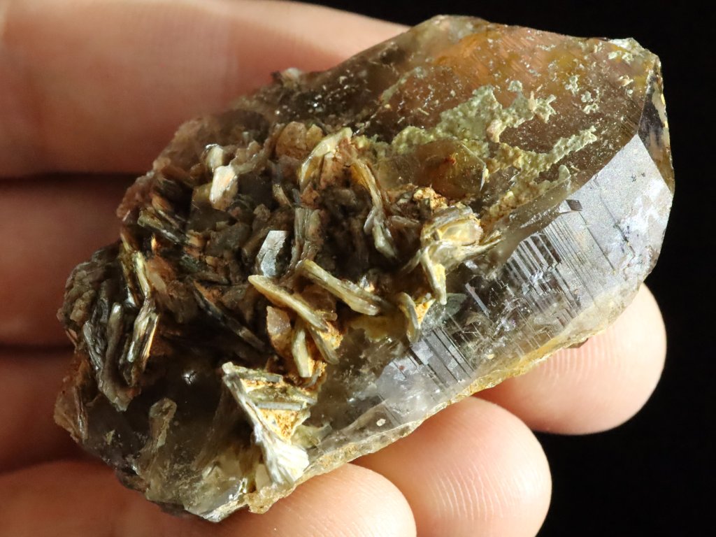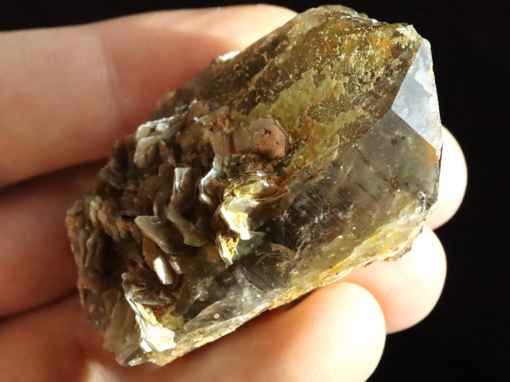Krystal záhnědy / morionu zdobený lupenitým muskovitem