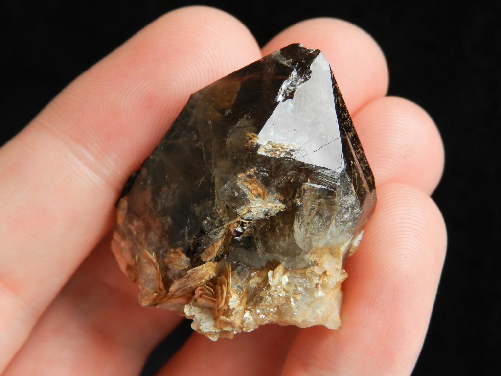 Tento menší krystal záhnědy má krásně zachovalé obvodové stěny i samotnou špičku, která je pouze mírně ťuklá v samotném vrcholu.