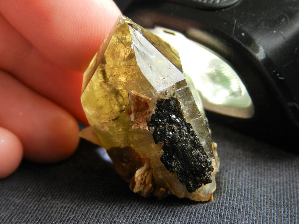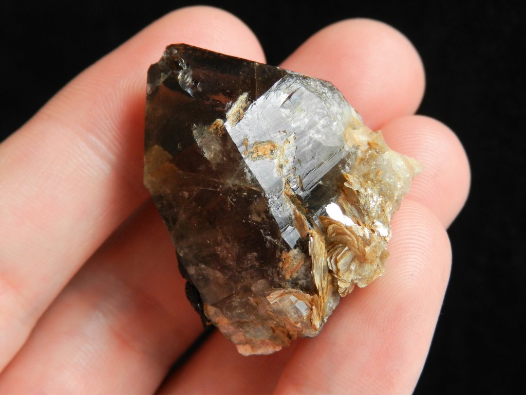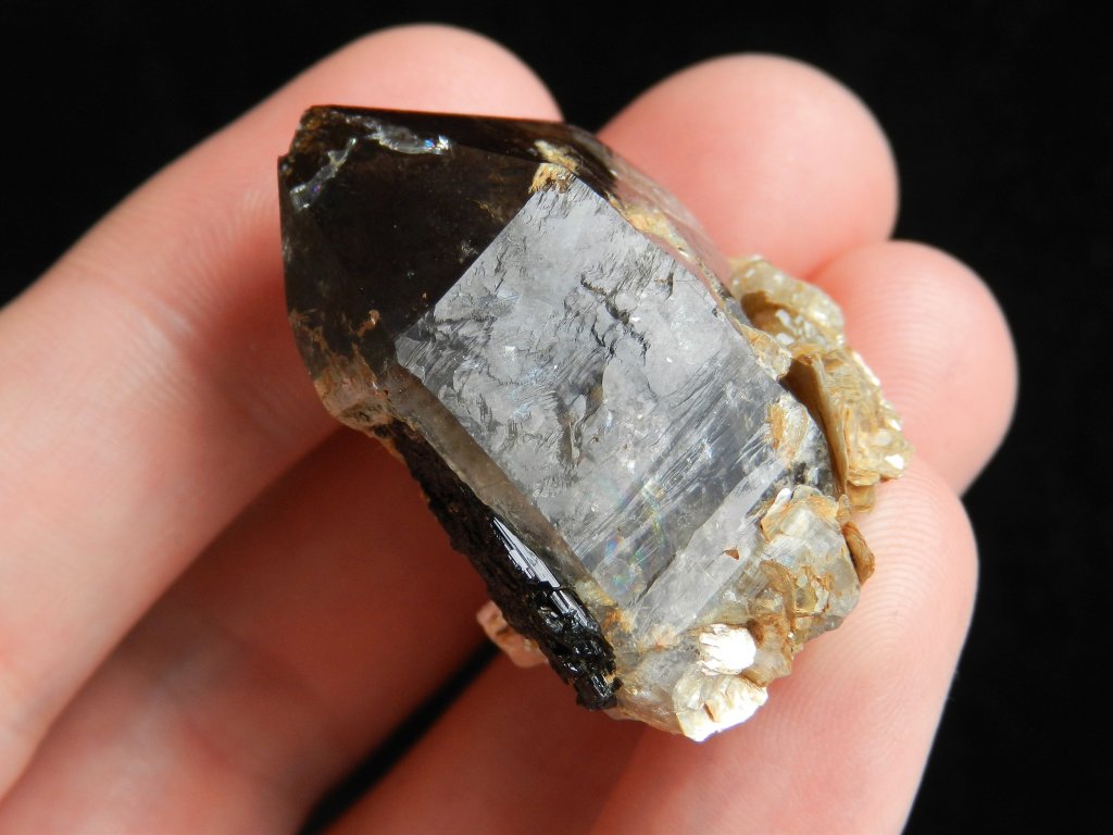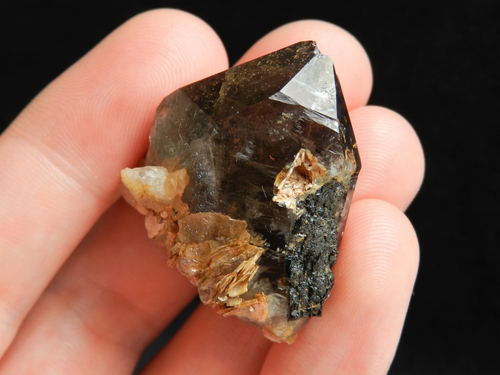 Zajímavostí také je, že ve spodní části krystalu můžete objevit přirostlé další minerály typické pro oblast Vysočiny. Najdete zde třeba černý turmalín skoryl, lupínky muskovitu nebo klasický šedý křemen.