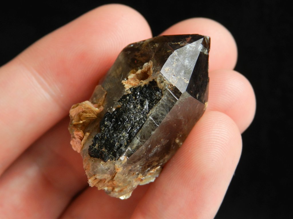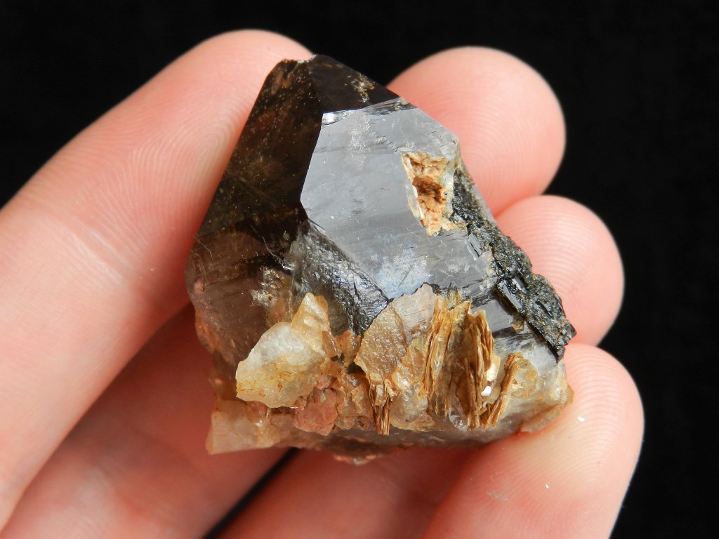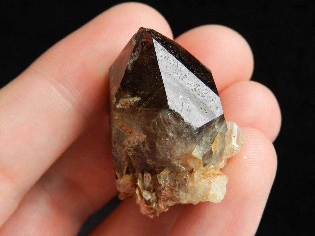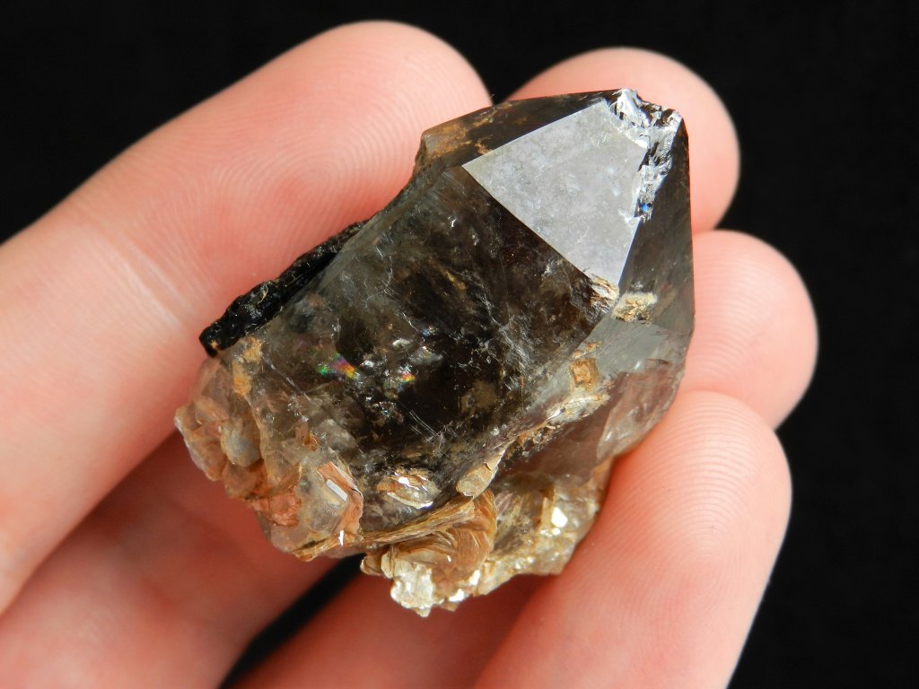 Tento menší krystal záhnědy má krásně zachovalé obvodové stěny i samotnou špičku, která je pouze mírně ťuklá v samotném vrcholu.