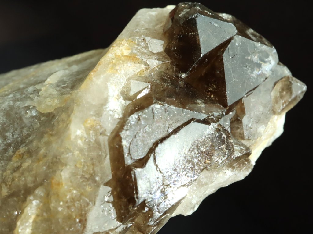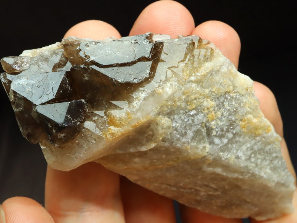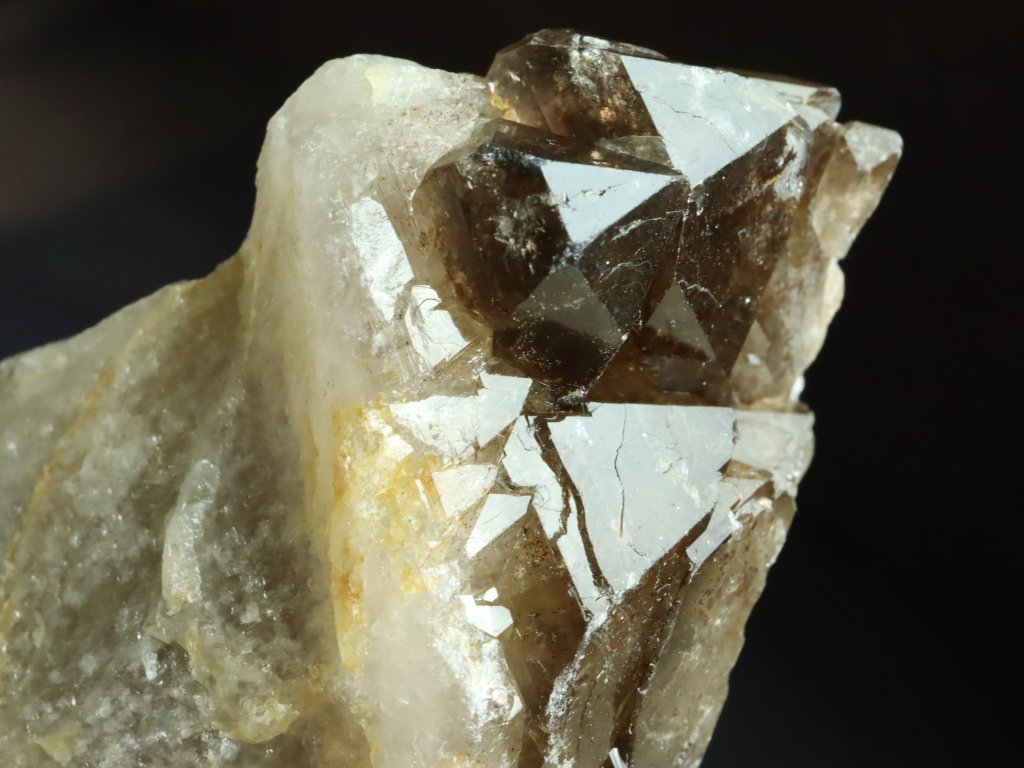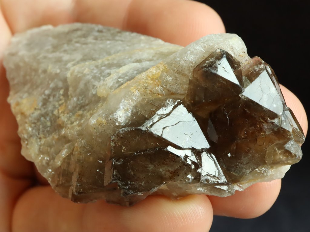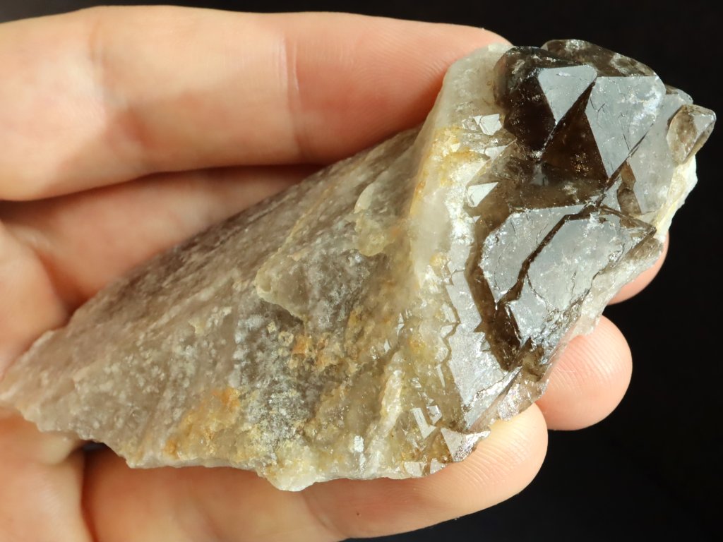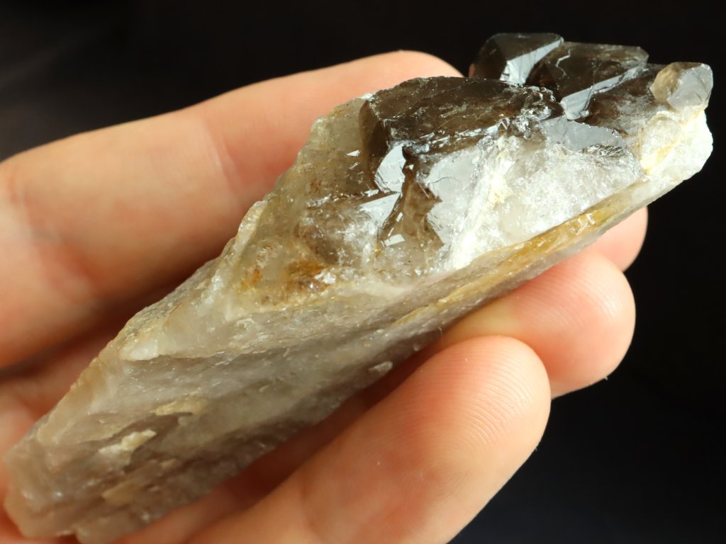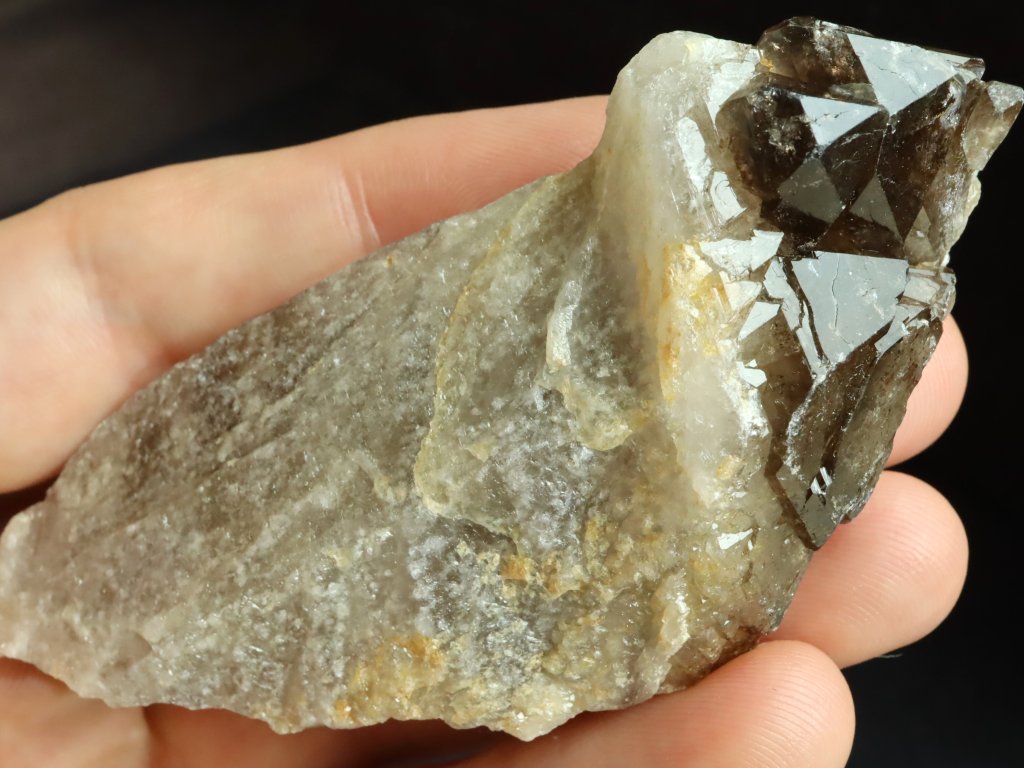 Záhněda je zde zajímavě narostlá na protáhlé křemenné podložce a z pohledové strany se pyšní vzácným stupňovitým nebo též elestiálním růstem. Krystalky / špičky jsou zde navíc moc hezky zachovalé.