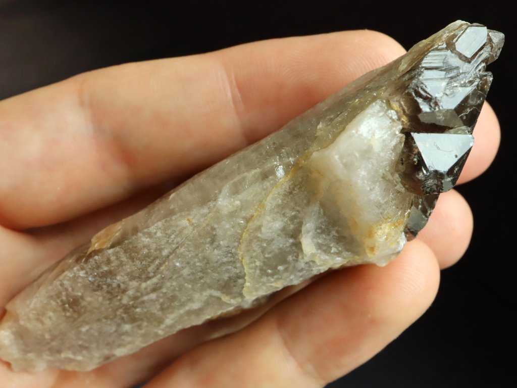 Krystalek temně kouřové záhnědy na křemenné podložce - Elestial