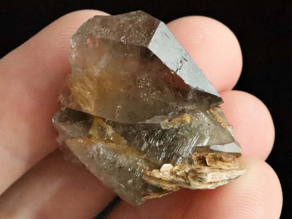 Jedná se o krystalek záhnědy, který je jednou boční stranou přirostlý k menšímu kousku křemene zdobeného muskovitem (stříbrně lesklou slídou).
