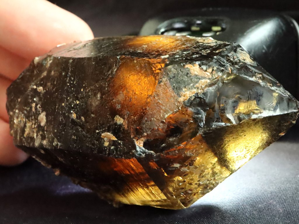 Senzační je pak samotná barva morionu, která má kvalitní černý odstín. Pokud však morion prosvítí sluneční paprsky či světlo silnější baterky, krystal se částečně rozzáří skutečně úžasnými a podmanivými hnědými tóny s medovým nádechem. (Prosvícení kamene baterkou je zachyceno na posledních dvou fotografiích, ve skutečnosti / naživo je však barva morionu při prosvícení ještě o něco krásnější).