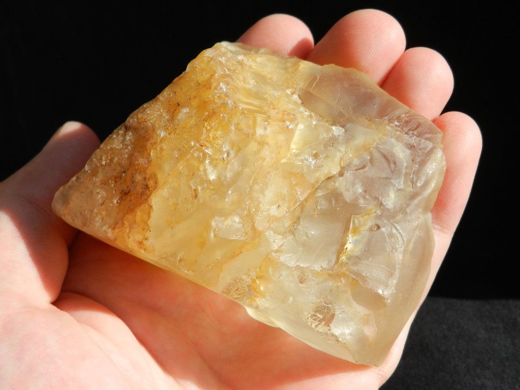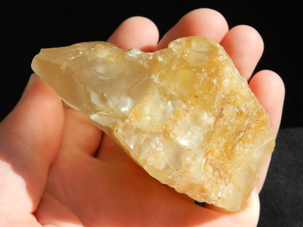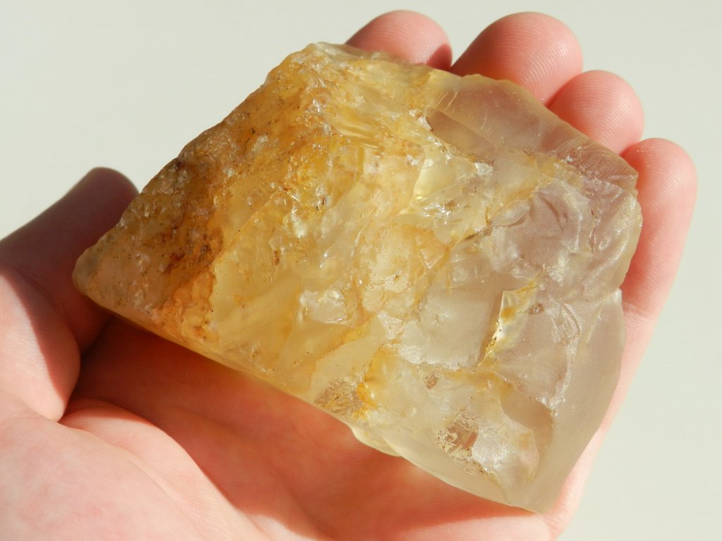 Pokud se na kámen podíváte na běžném denním světle či ve stínu, může se na první pohled zdát, že je v této jedné polovině poměrně hodně křemene, pokud však vzorek prosvítíte sluníčkem nebo silnější baterkou, zjistíte, že křemene se zde nachází pouze menší množství a převládá zde citrín.