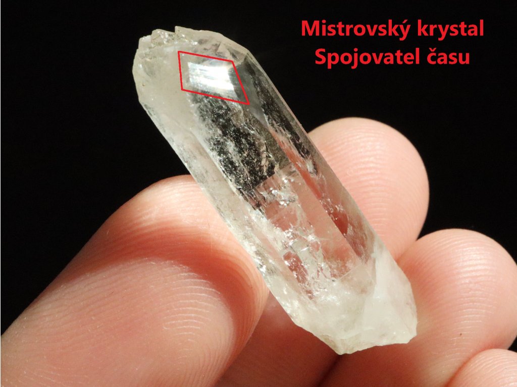Špice tohoto křišťálu se sice z větší části nezachovala, i tak zde však můžete objevit unikátní plošku (fazetu), díky které můžeme tento křišťál zařadit mezi vzácné Mistrovské krystaly a sice tzv. Spojovatel času. Tuto specifickou plošku jsme pro vás znázornili na jedné z fotografií.