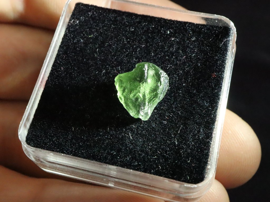 Vltavín obdržíte v kvalitní (hodnotné) uzaviratelné průhledné plastové krabičce s polstrovaným vnitřkem - viz. foto. Kamínek se vám tak nejen nikam nezatoulá, ale zároveň se jím budete moci přes průhledné plastové víčko krabičky i skvěle kochat.