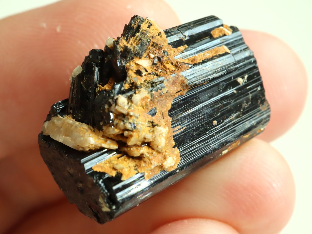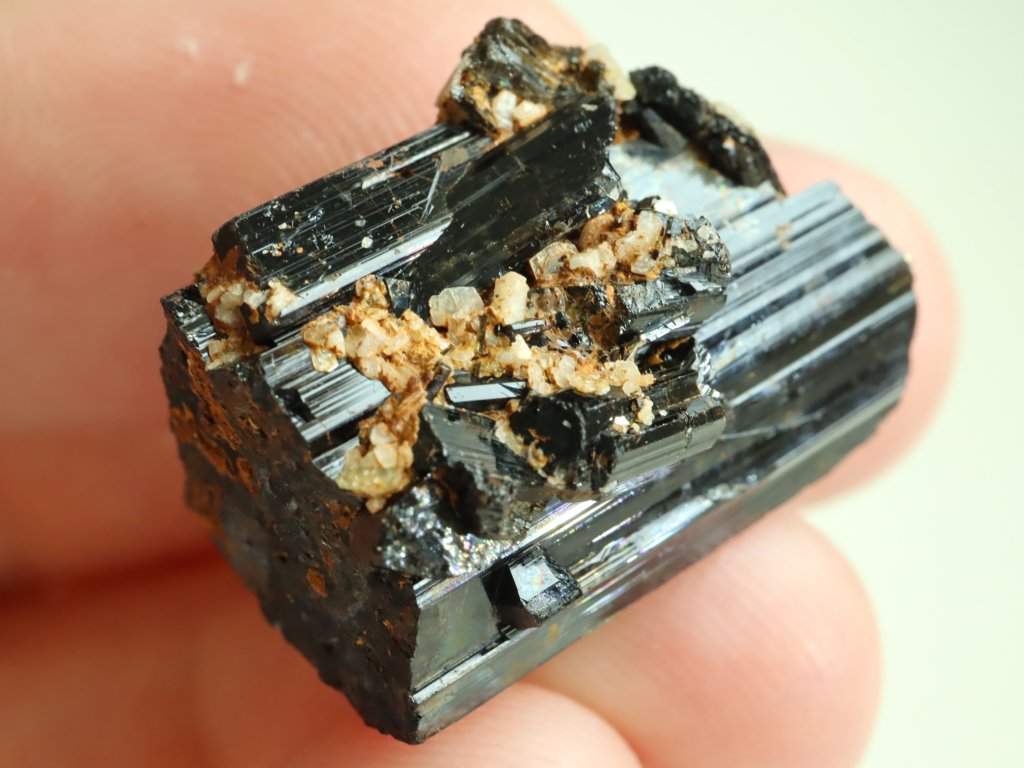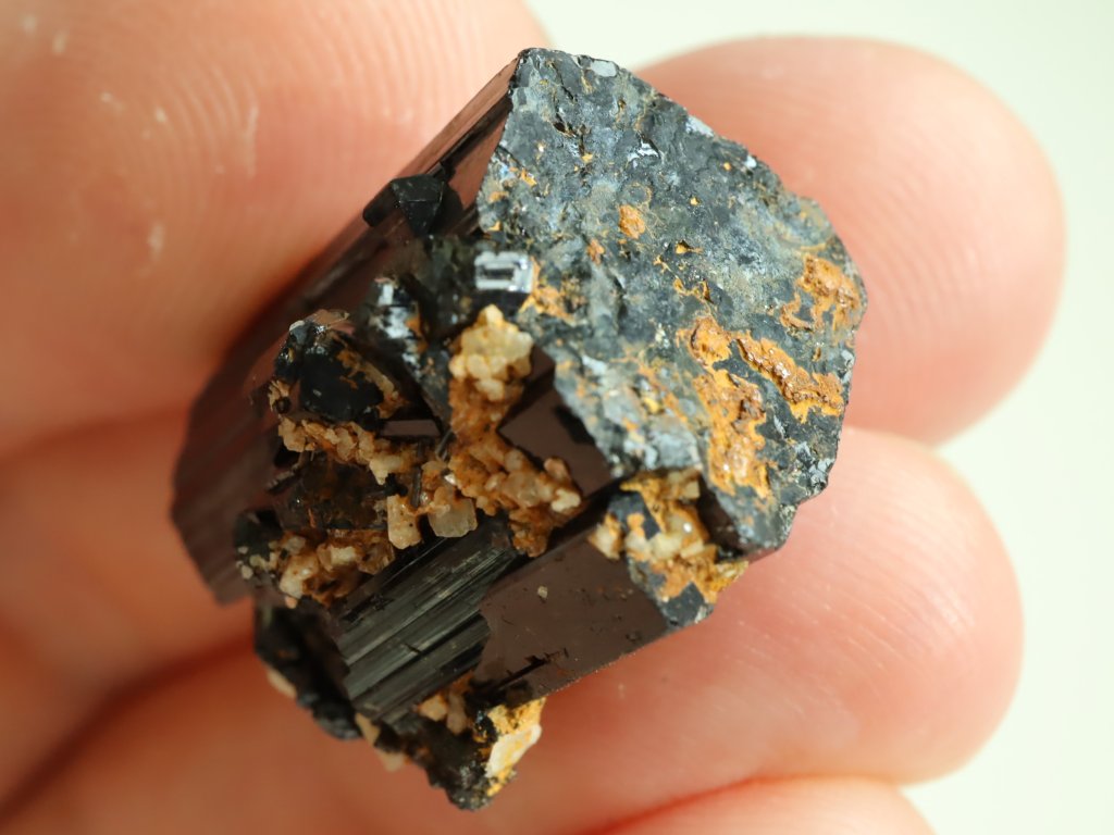 Místy je skoryl decentně porostlý bílým albitem nebo pokrytý povlakem hnědo-oranžového limonitu.