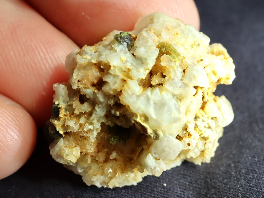 Krystalky zeleného epidotu jsou zde narostlé na krásné podložce z bílého albitu.