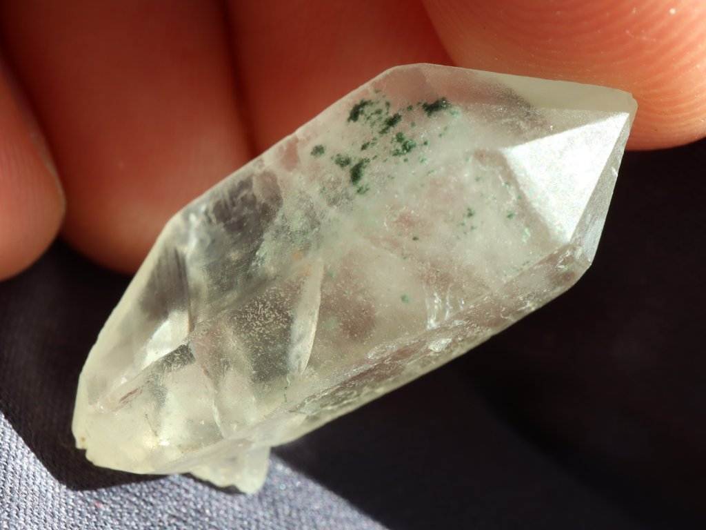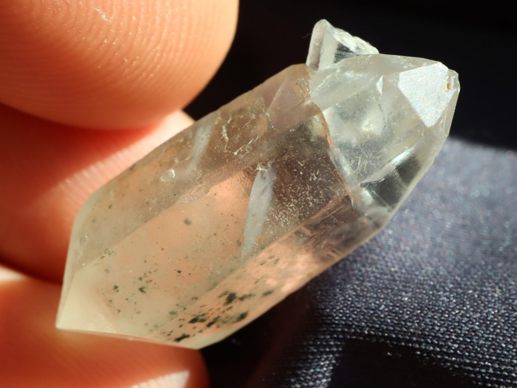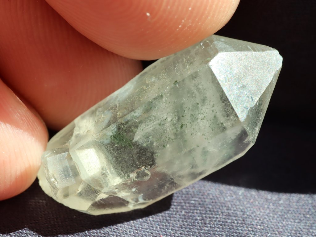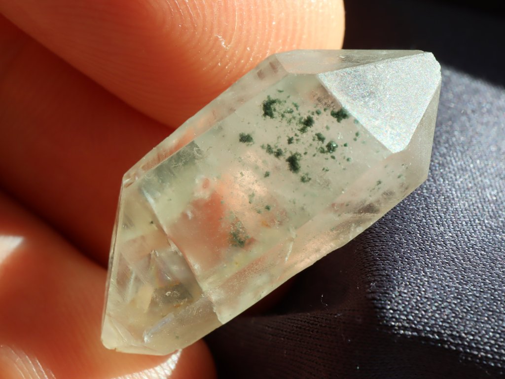 Menší oboustranný krystalek křišťálu s drobným chloritem