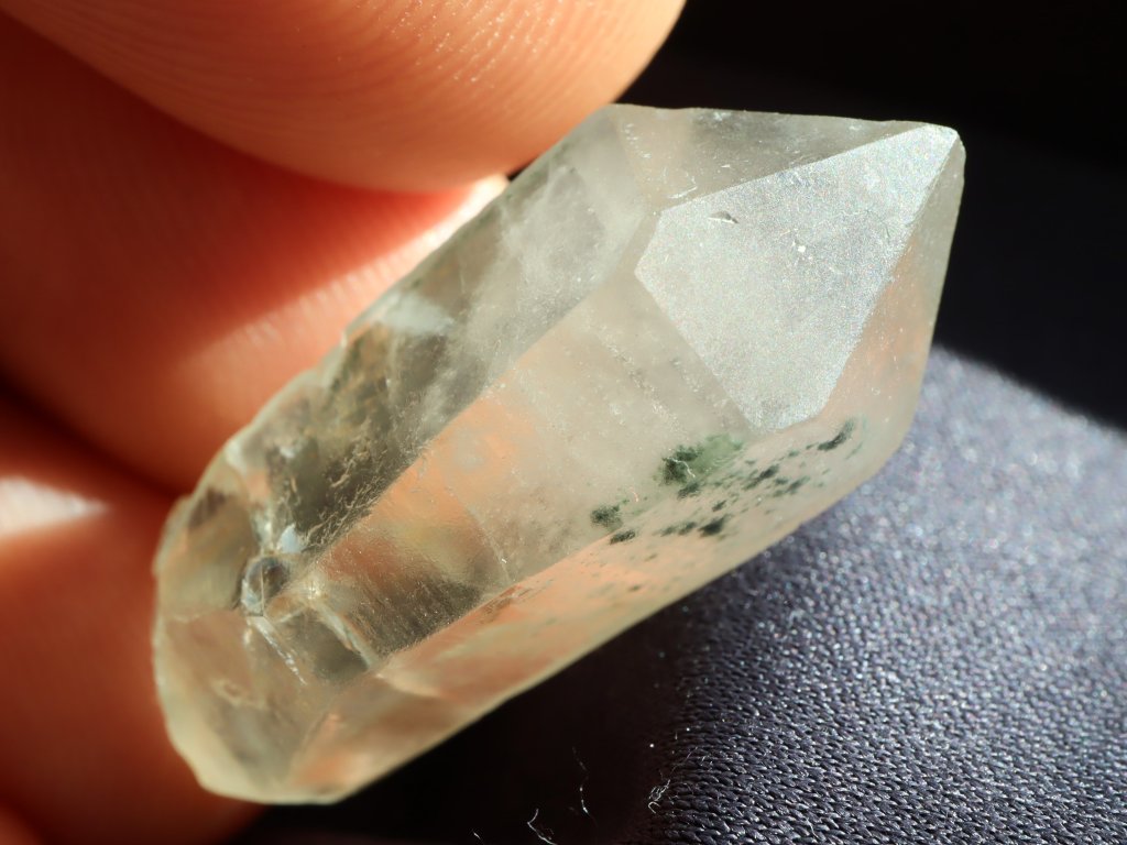 Uvnitř je jedna polovina krystalku protkaná peříčky, druhá polovina je pak lehounce zakalená množstvím mlhovinek. Spatřit tu však můžete i zelené stopy chloritu, což přidává křišťálu na originalitě.