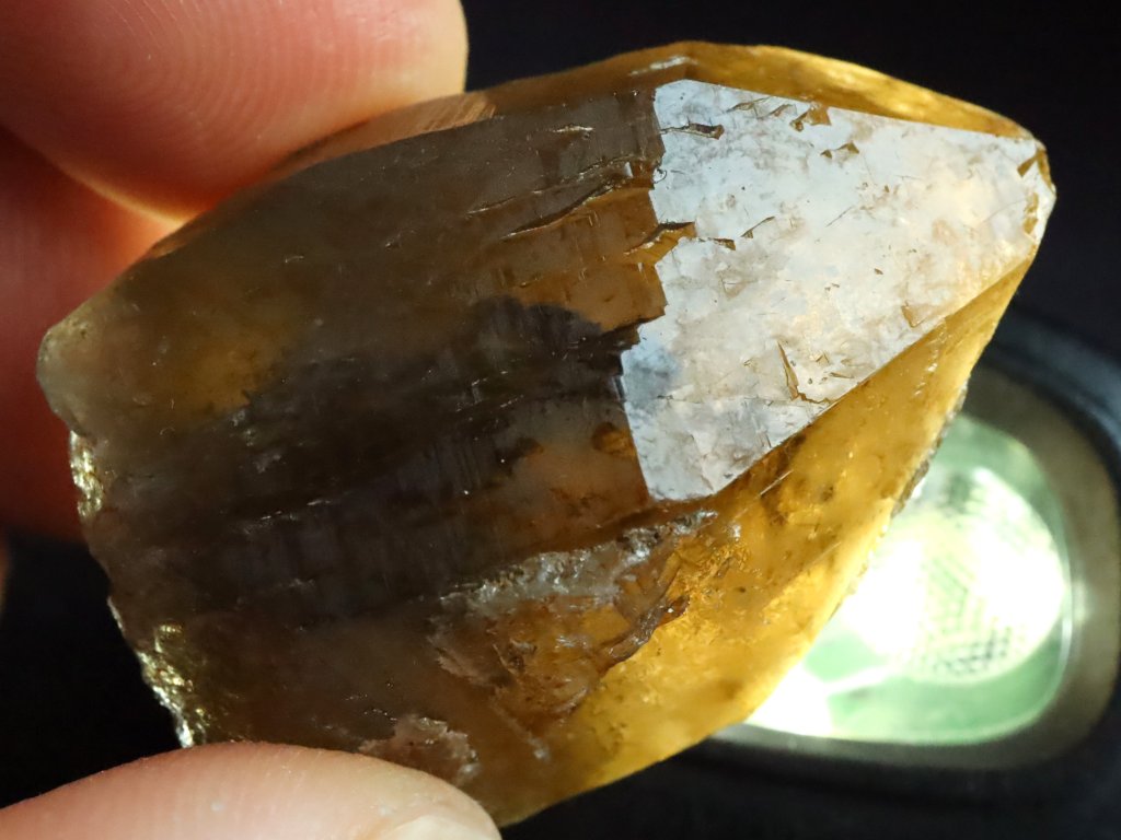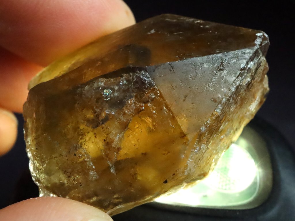 Morion má na běžném denním světle / ve stímu temně hnědý až prakticky černý odstín. Krystal lze však i částečně prosvíítit, to je pak jemně hnědý až kouřový - viz. poslední dva snímky. Uvnitř je však morion spíše zakalené množstvím inkluzí v podobě peříček a mlhovin.