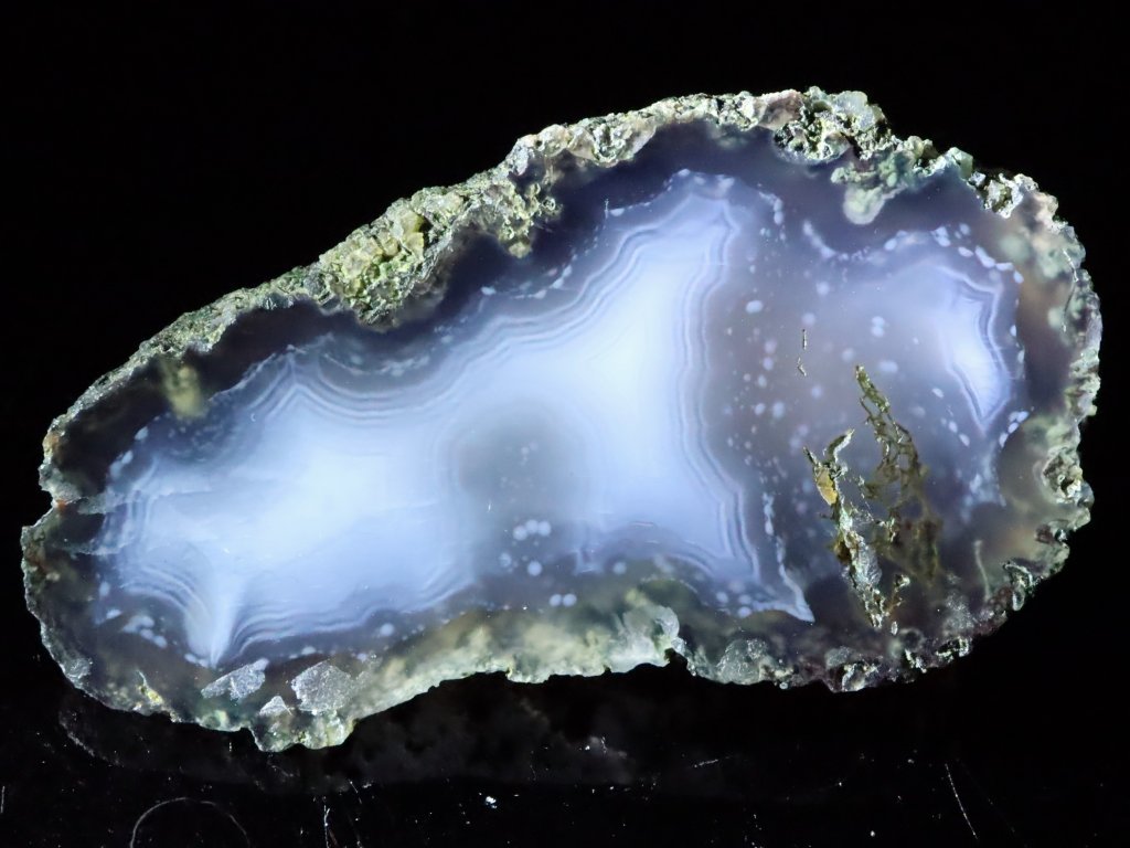 Achát má obláčkově modrý odstín s bílými tóny a čirý průsvitný lem s hezkou kresbou.