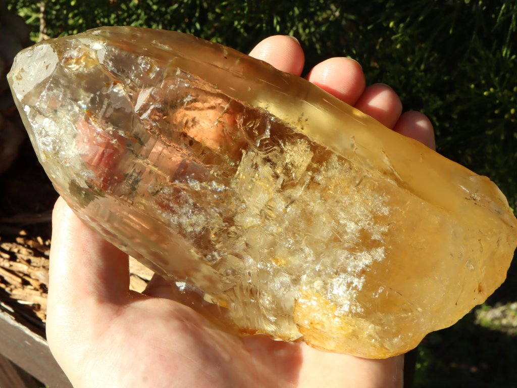 Citrín se totiž na sluníčku pyšní podmanivým, velmi kvalitním a vzácným středně až sytě žlutým odstínem se zlatavými tóny a nepatrným kouřovým nádechem ve špici krystalu.