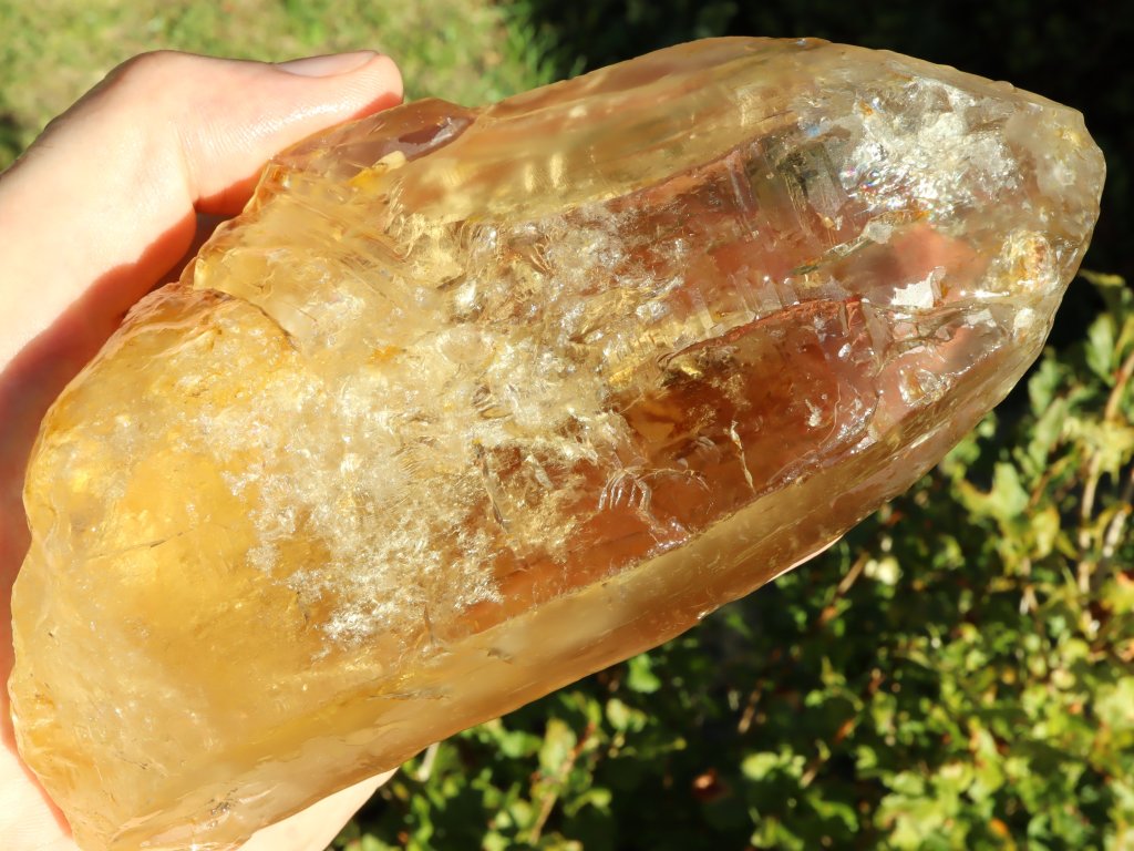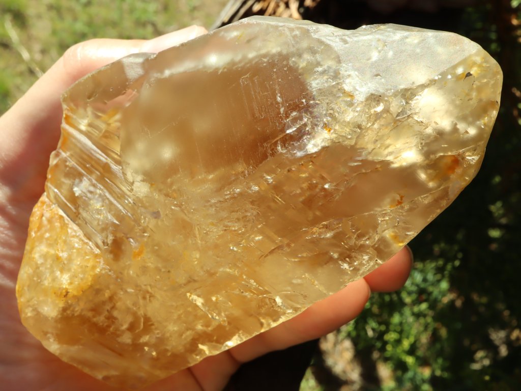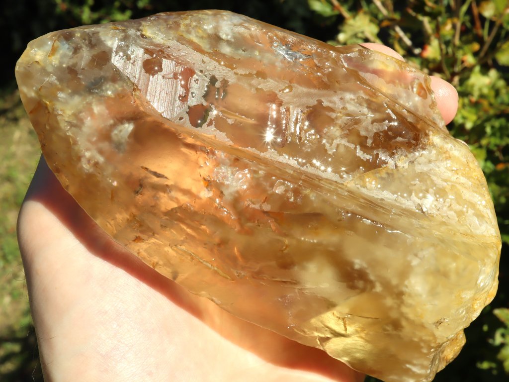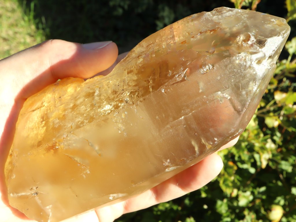 Citrín je také celý perfektně průsvitný (sluníčkem či baterkou). Krystal má to štěstí, že z pohledové strany má velkou lesklou stěnu, takže při prosvícení můžete i výborně nahlédnout takřka do celého vnitřního světa tohoto citrínu.